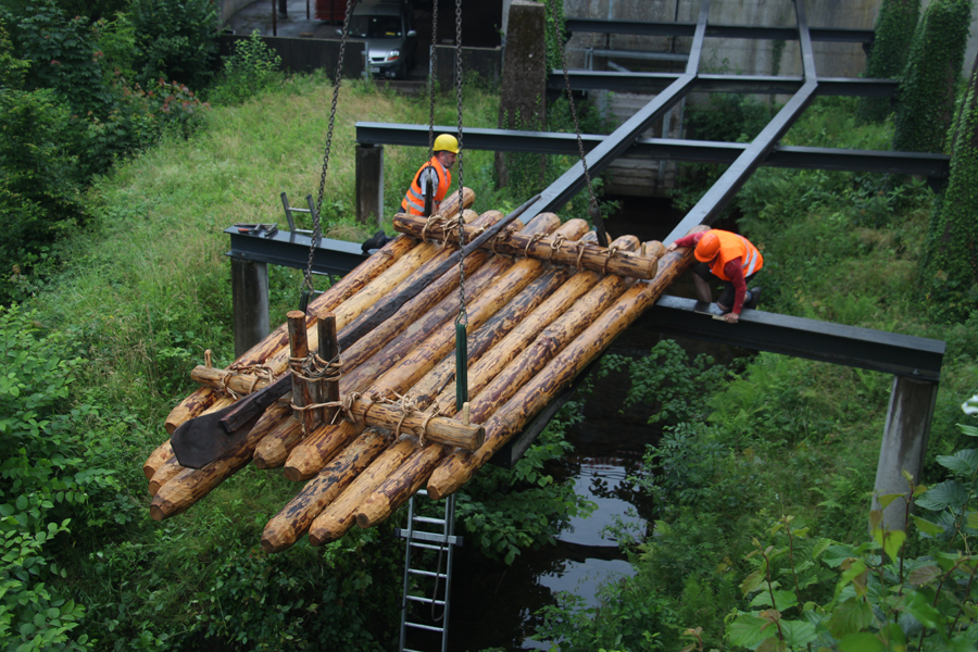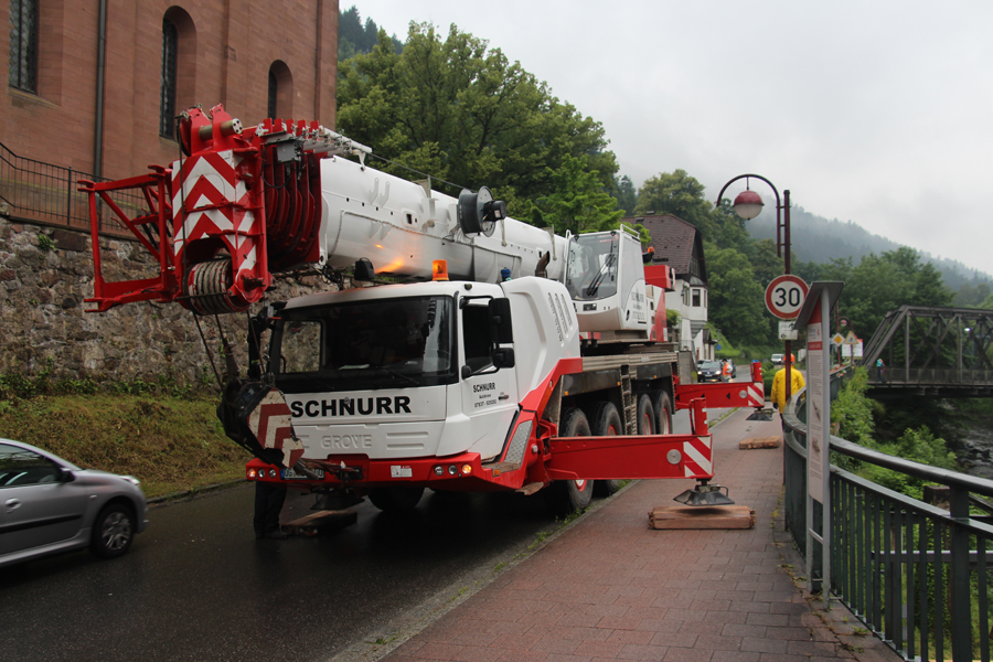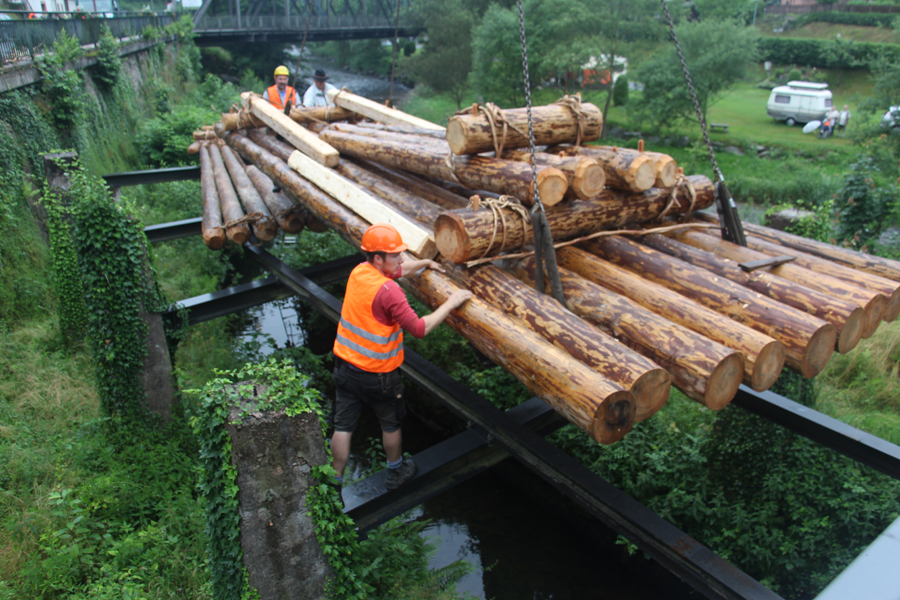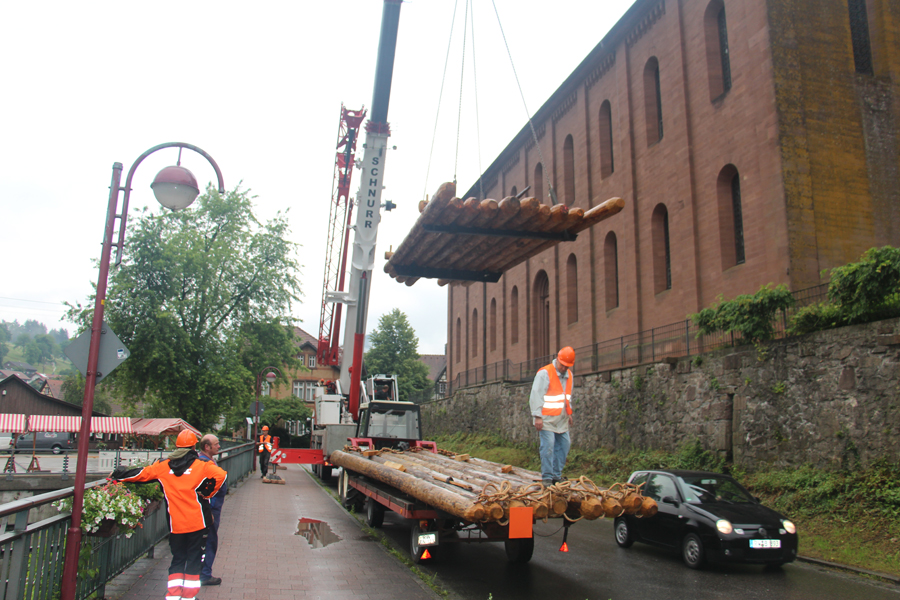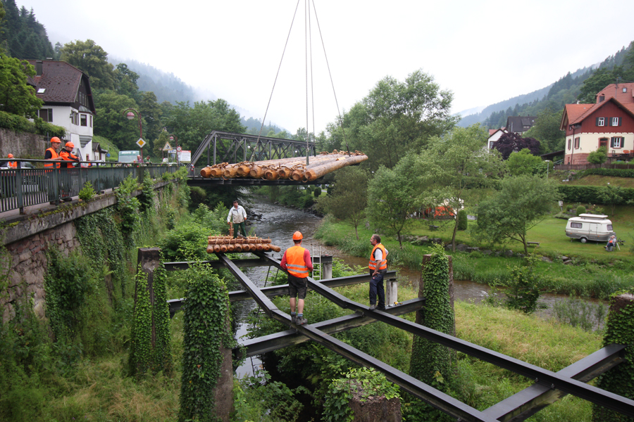 Die Schiltacher Flößer erneuerten das 8 Jahre alte Schaufloß an der Schüttesäge. Mit einem Schwerlastkran wurde es auf seinen Platz gebracht.