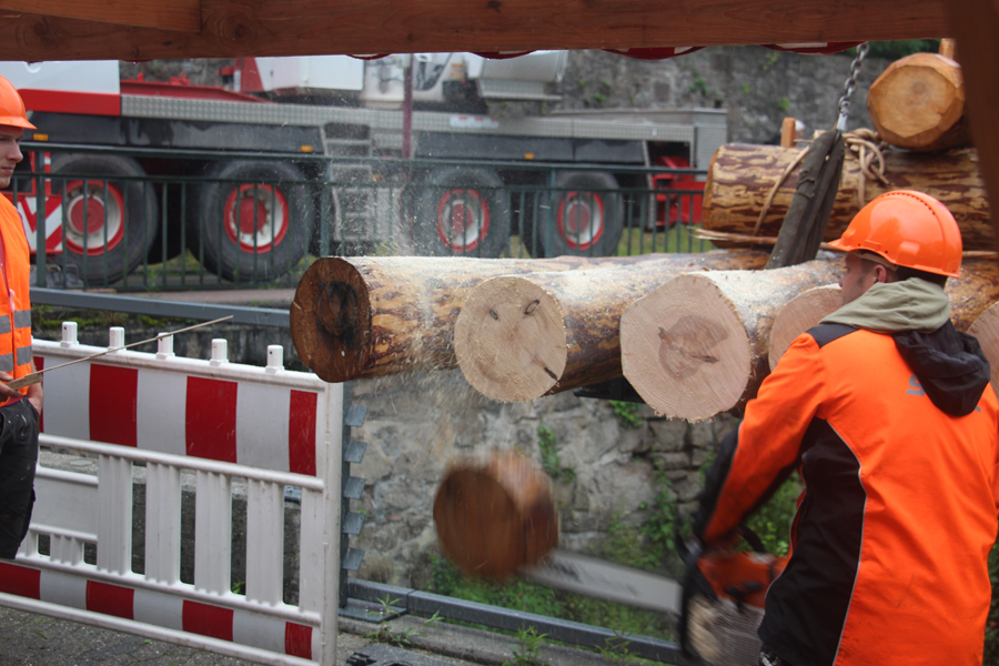 Das Schaufloß an der Schüttesäge in Schiltach musste erneuert werden. Vor acht Jahren hatten es die Flößer aus Anlass des Internationalen Flößertreffens dort angebracht. Nun war das Holz teilweise verwittert und faulte. Mit einem Kranwagen wurde das Floß an die richtige Stelle gehievt. Das Floß thront mehrere Meter über dem Schüttesägekanal auf einem Stahlträgerrahmen, der von alten Betonpfeilern des ehemaligen Sägegebäudes gehalten wird. Bereits im vergangenen Jahr waren sie Stämme während der Winterruhe im Stadtwald geschlagen worden. Am Floßschopf machten sich die Schiltacher Flößer unter der Leitung des stellvertretenden Obmanns, Hartmut Brückner ab März ans Werk und bauten immer dienstags am neuen Schaufloß. Insgesamt verbauten die Schiltacher Flößer 32 Stämme mit rund 30 Festmetern Holz. Das neue dreiteilige Schaufloß ist 3,20 m breit und rund 25 m lang. Rund 14 Tonnen Gewicht liegen auf der Stahlträgereinheit an der Kinzig.