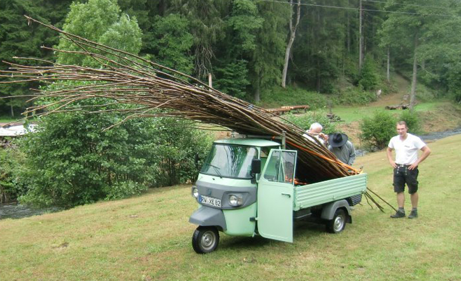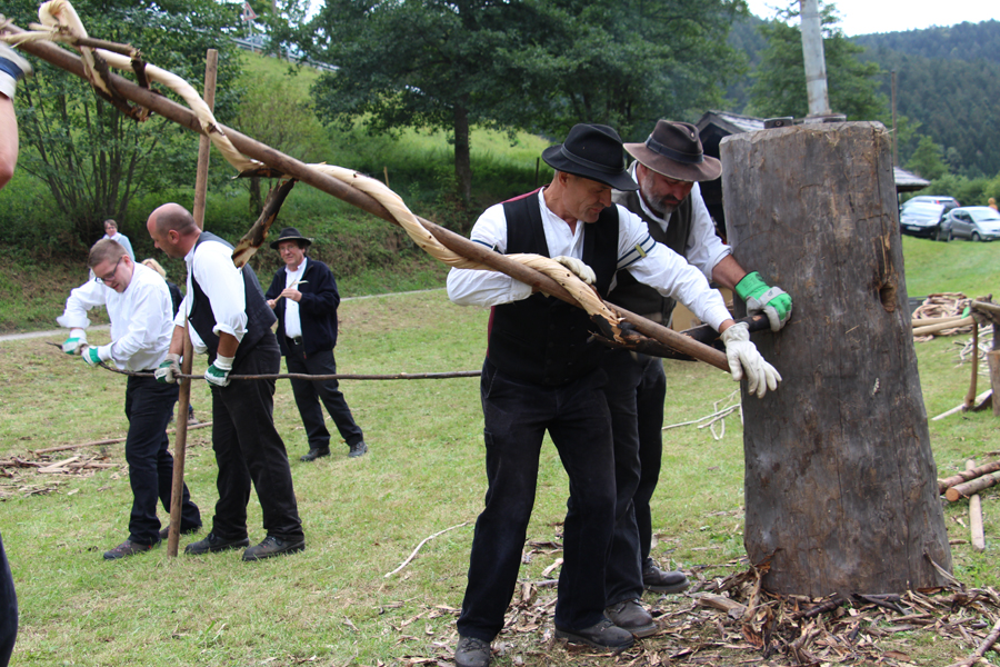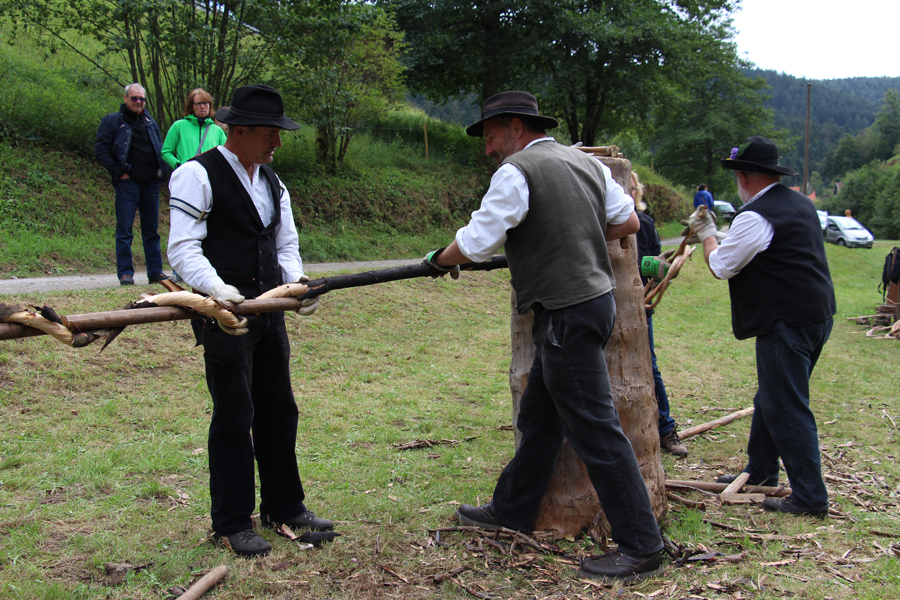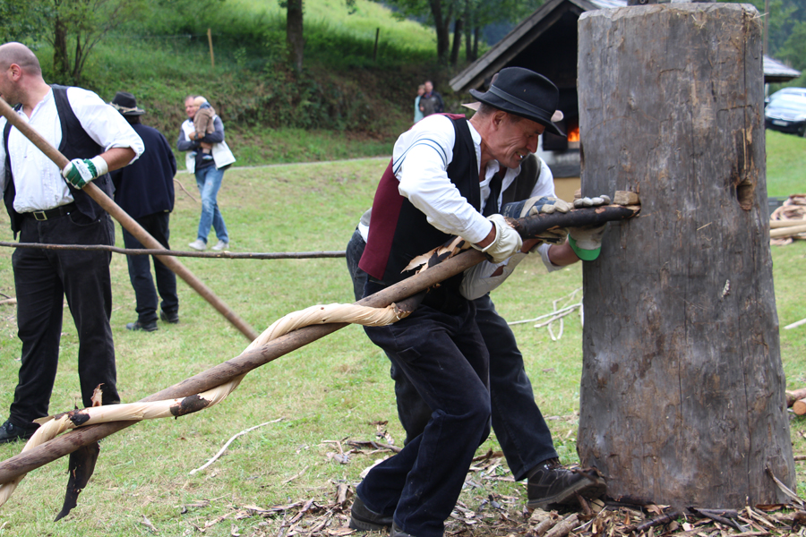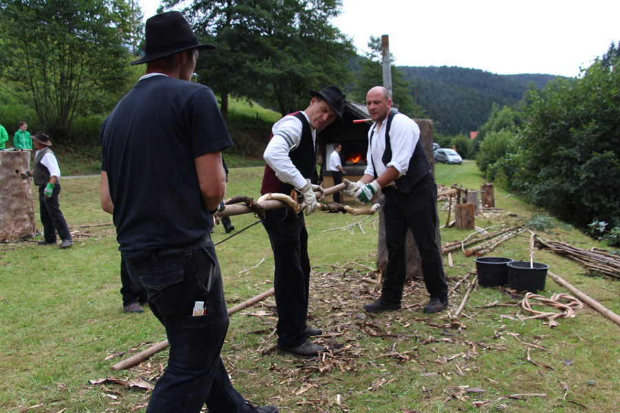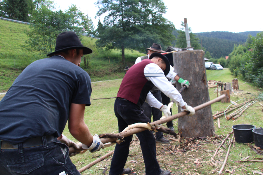 Bis zum Abend wurden pausenlos Wieden gedreht, größtenteils handelte es sich um Haselnussstangen, aber auch einige junge Tannenstämmchen wurden verarbeitet. Bei einem solchen Exemplar mit 5 m Länge und einem Durchmesser von 5 cm wurde den immer zahlreicher sich einfindenden Zuschauern klar, wie anstrengend diese Arbeit ist: Drei Flößer – statt der sonst üblichen zwei – waren mit der Herstellung dieser Wiede beschäftigt.