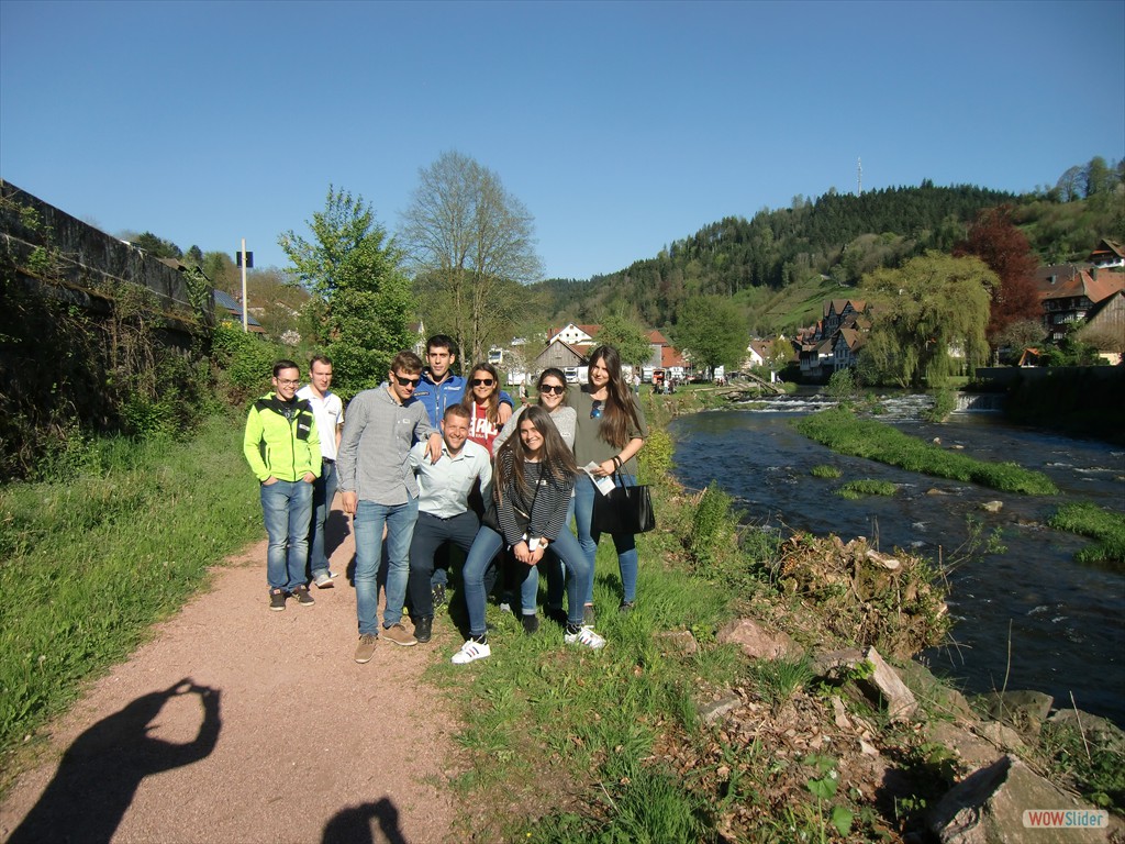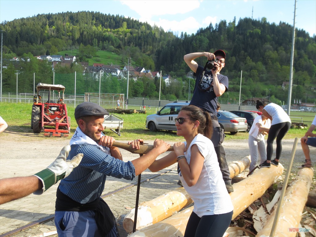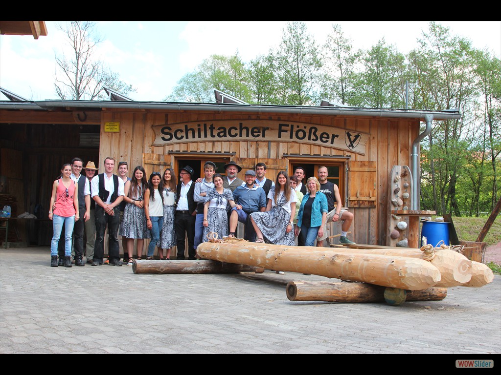 In den Morgenstunden des Himmelfahrtstags landete die katalanische Truppe mit dem Flieger in Basel, Otto Schinle und Tobias Isenmann verfrachteten sie per PKW zu Familie Kipp auf die Schmelze, wo sie für die nächsten Tage Quartier fanden. Als Einführung stand ein Spaziergang durchs Städtle auf dem Programm. Die Verständigung klappte das ganze Wochenende auf Englisch, wobei der Stadtführer bei vielen Fachausdrücken auf die Mithilfe seiner Flößerkameraden angewiesen war. Ein traditionelles „Schwarzwälder Vesper“ im Floßschopf stand am Ende des ersten Tags.