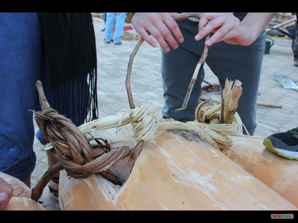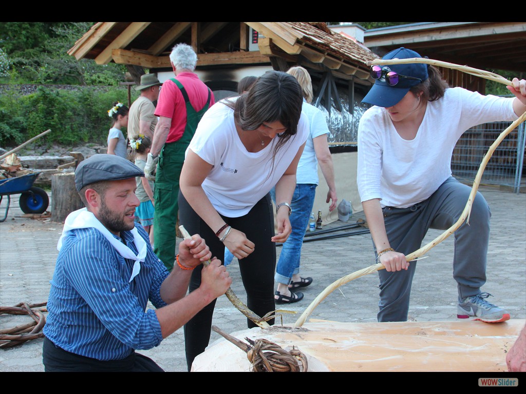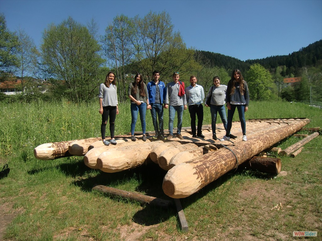 Dies zeigte sich auch bei der Arbeit rund ums Floß am folgenden Samstag. Gemeinsam fällten die Deutschen mit ihren katalanischen Gästen einen Baum, entasteten, schälten und transportierten ihn zum Floßschopf. Mit Hilfe des Wiedofens wurde das Bindematerial hergestellt, Löcher gebohrt und ein kleines Floß eingebunden. „Ein Floß haben wir zu Hause auch schon gebaut, aber einen Baum mit der Axt von Hand geschlagen, haben wir noch nie“, freuten sich die jungen Spanier.