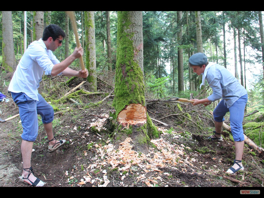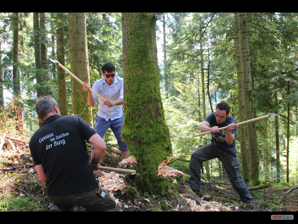 Für das lange Wochenende wurde ein abwechslungsreiches Programm zusammengestellt, um den jungen Leuten Manches rund um das Thema Holz und Flößerei im Kinzigtal näher zu bringen. Vom Fällen eines Baums mit traditionellen Werkzeugen bis zum Einbinden eines kleinen Floßes reichte das abwechslungsreiche Programm.