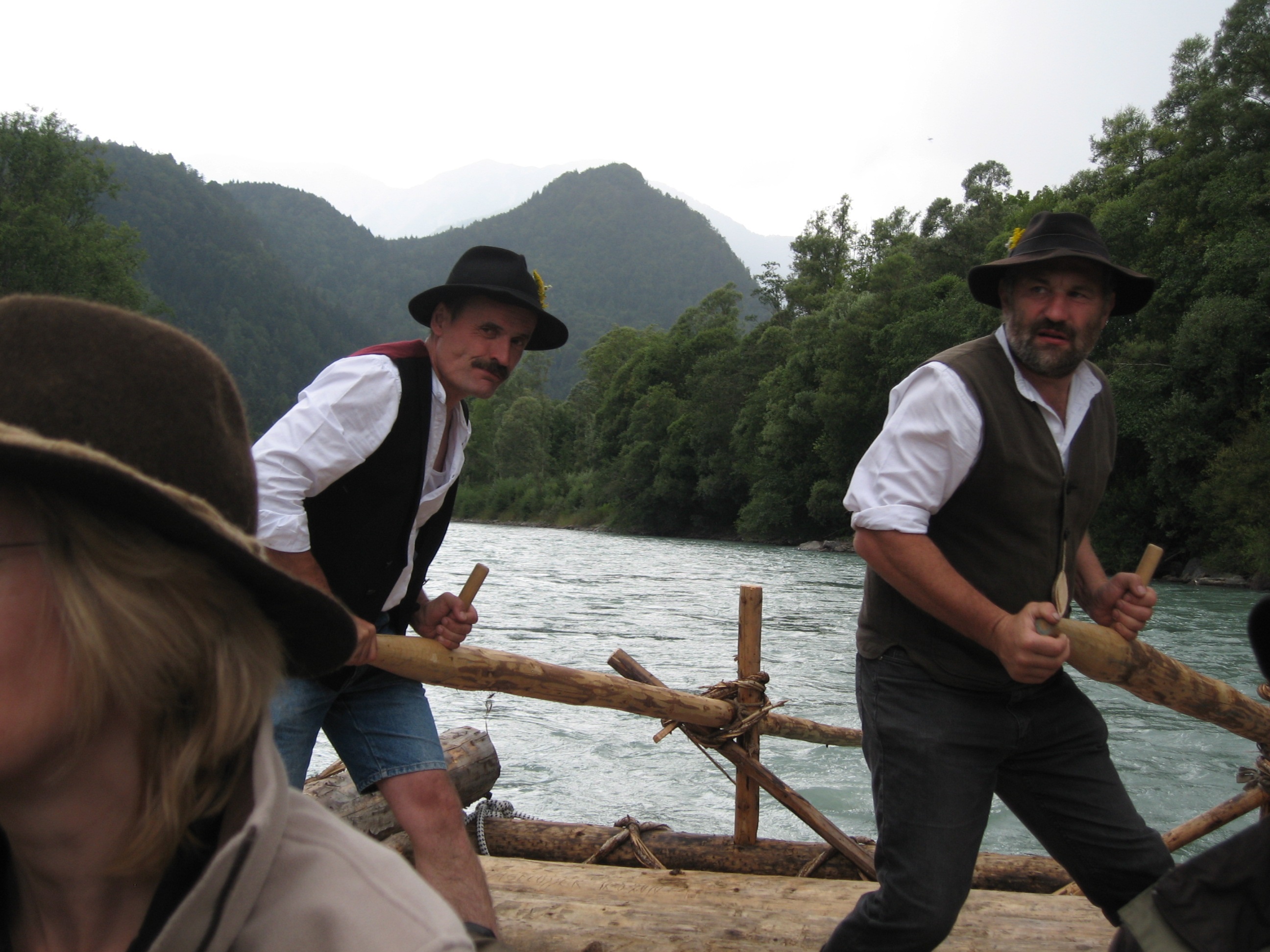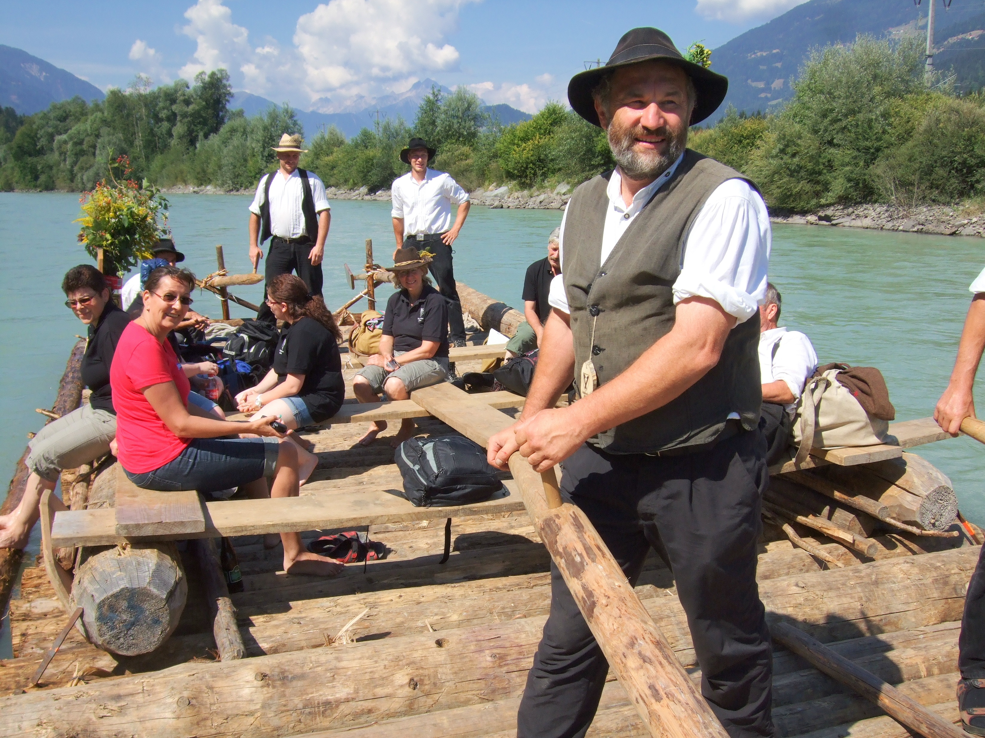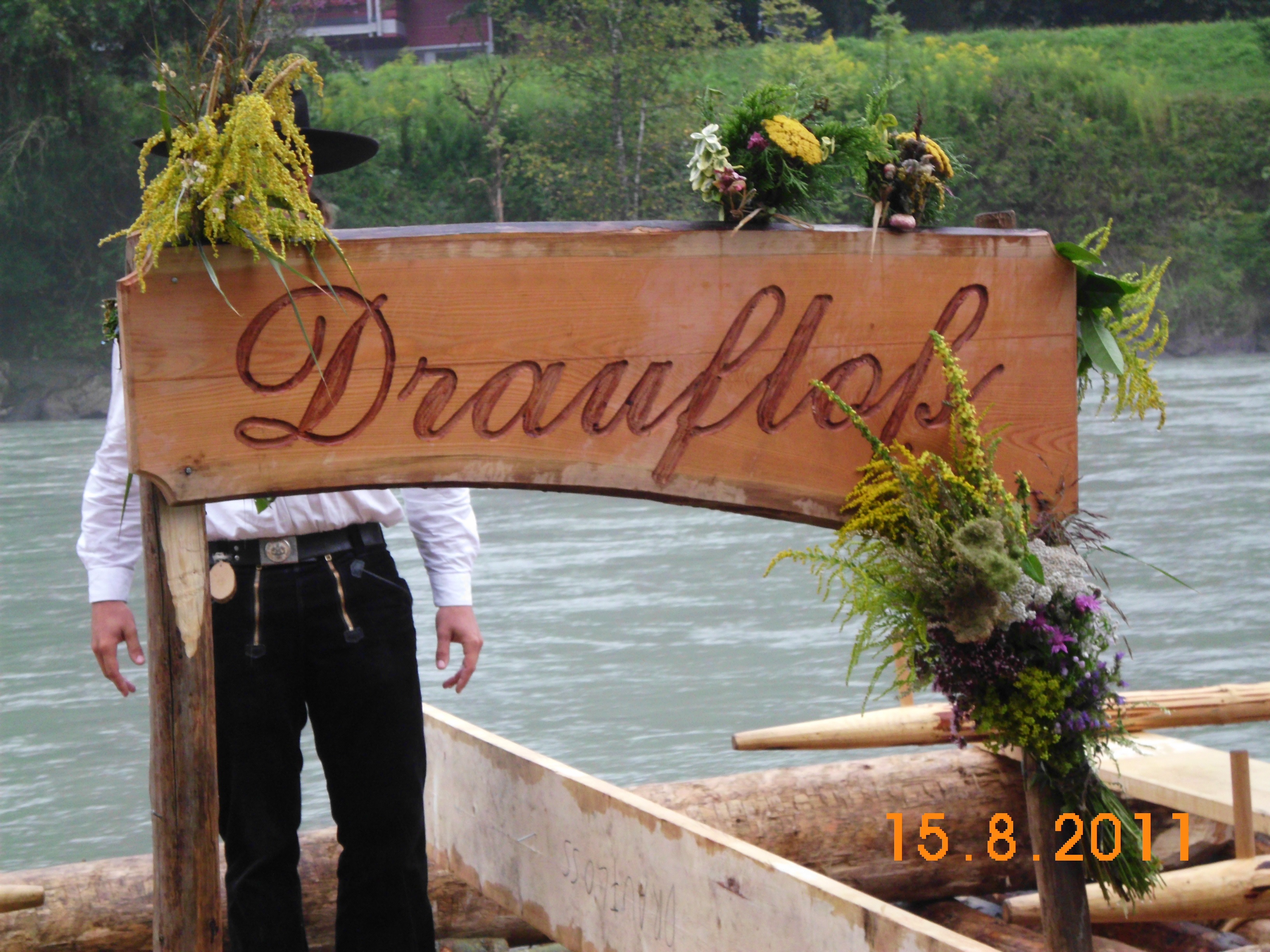 Mit einigen Passagieren als Oblast ging es dann auf große Fahrt. Bei dem niedrigen Wasserstand in diesem Jahr kein leichtes Unterfangen: tückische Kiesbänke und Hindernisse, die sonst im tiefen Wasser verborgen sind, bedrohten diesmal die Floßfahrt auf der mächtigen Drau.