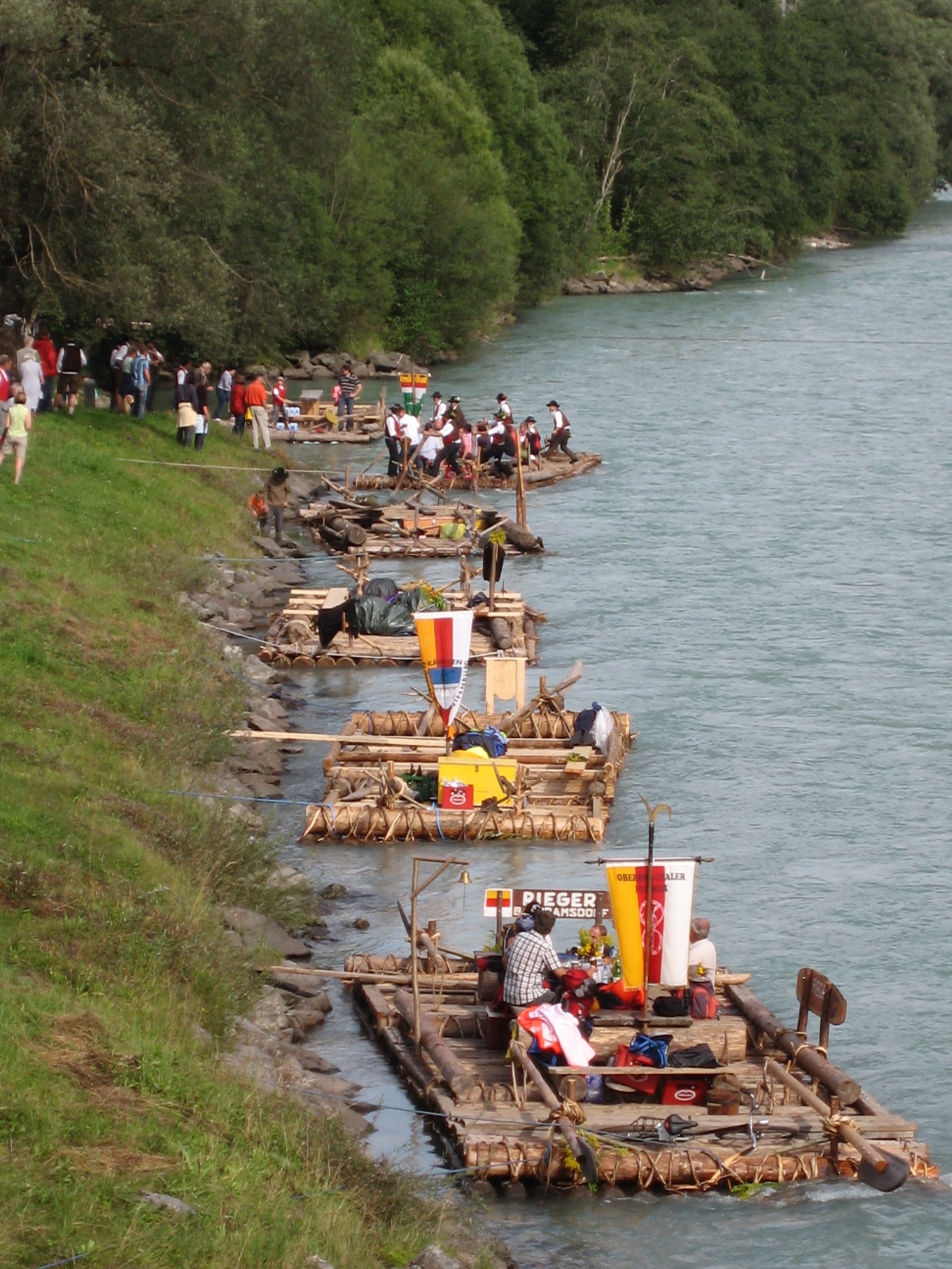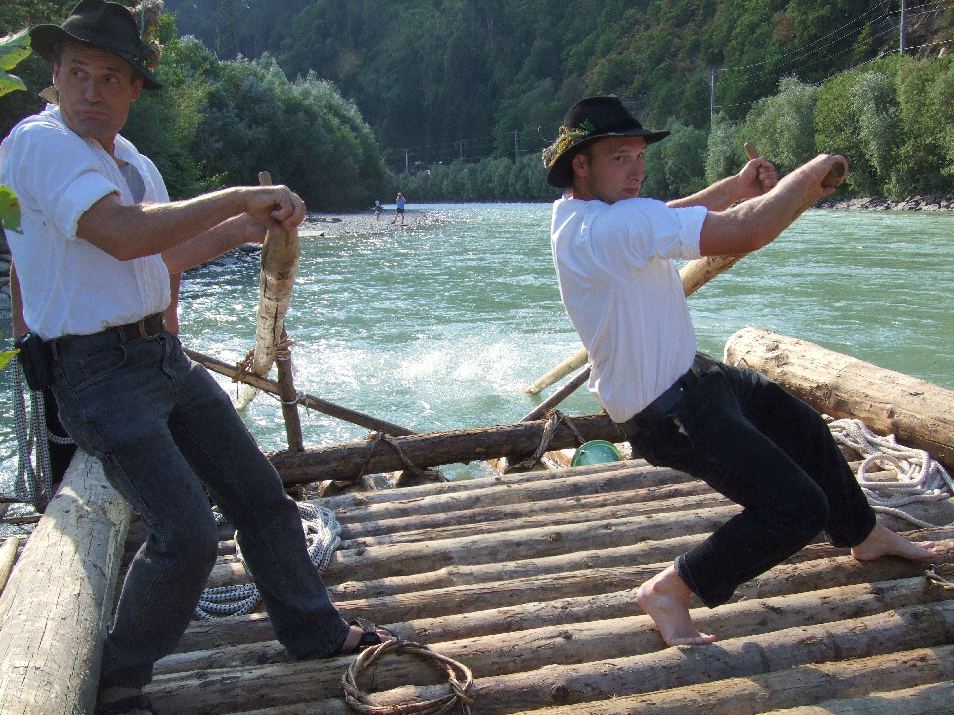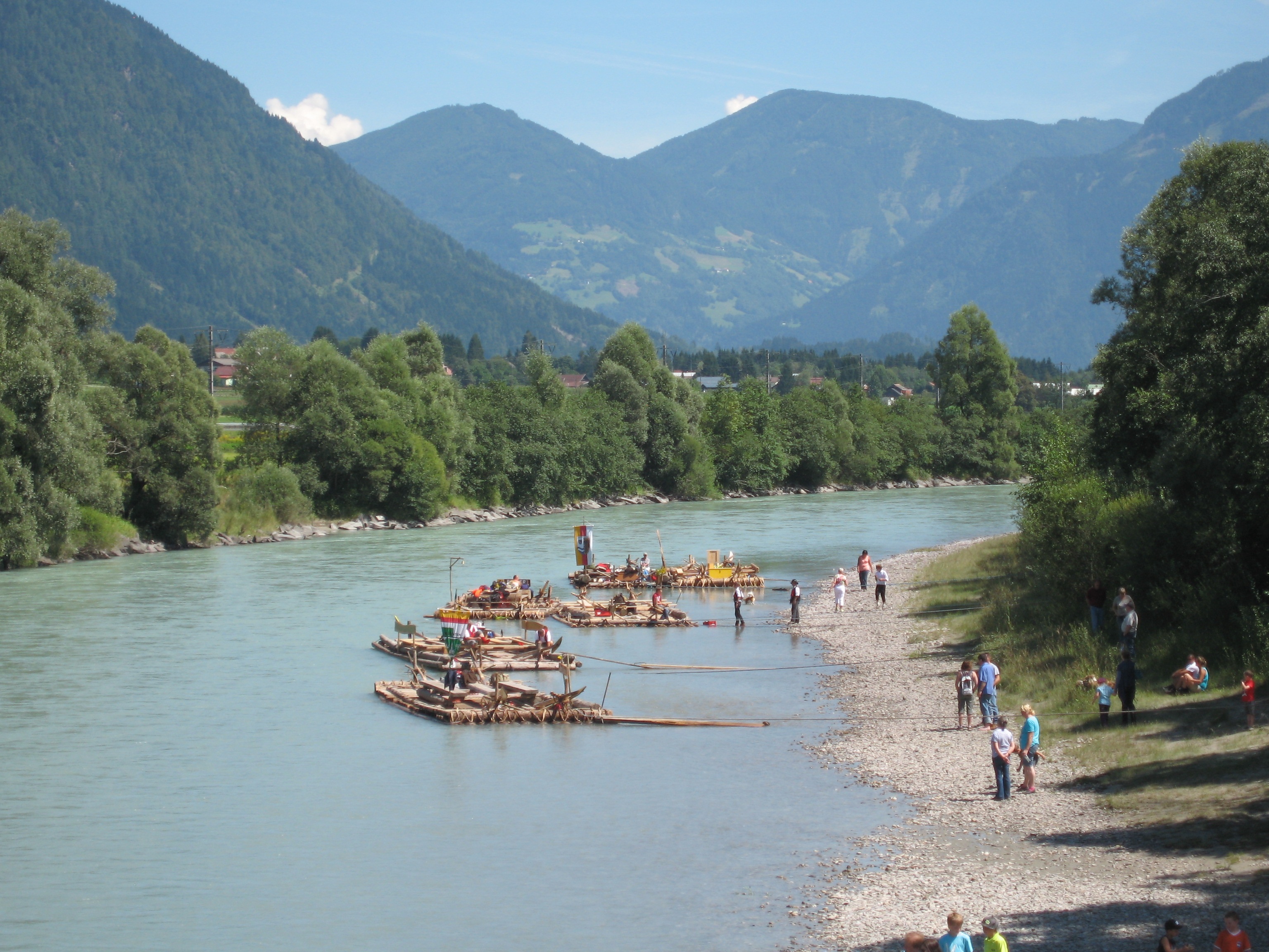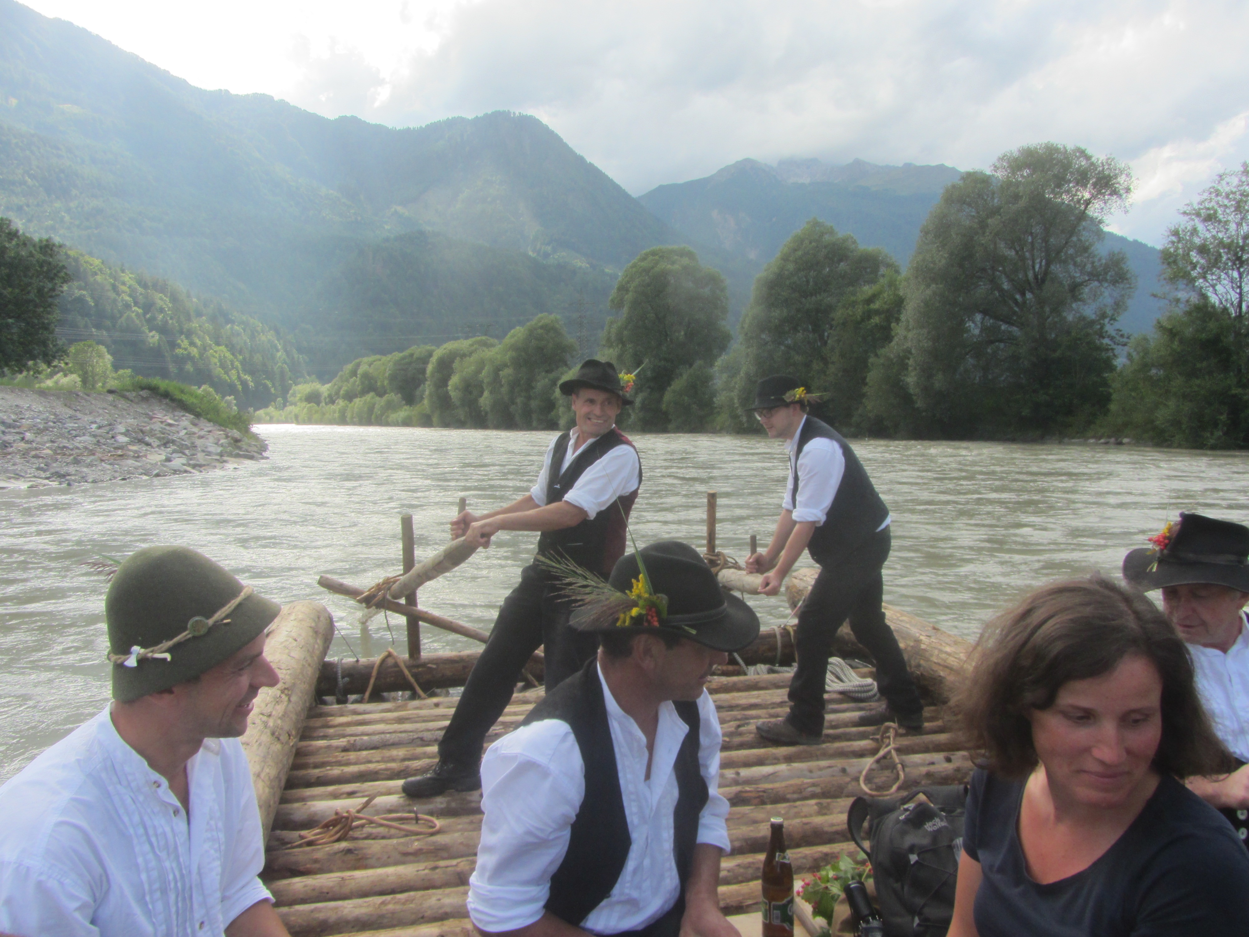 Mit einigen Passagieren als Oblast ging es dann auf große Fahrt. Bei dem niedrigen Wasserstand in diesem Jahr kein leichtes Unterfangen: tückische Kiesbänke und Hindernisse, die sonst im tiefen Wasser verborgen sind, bedrohten diesmal die Floßfahrt auf der mächtigen Drau.