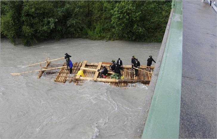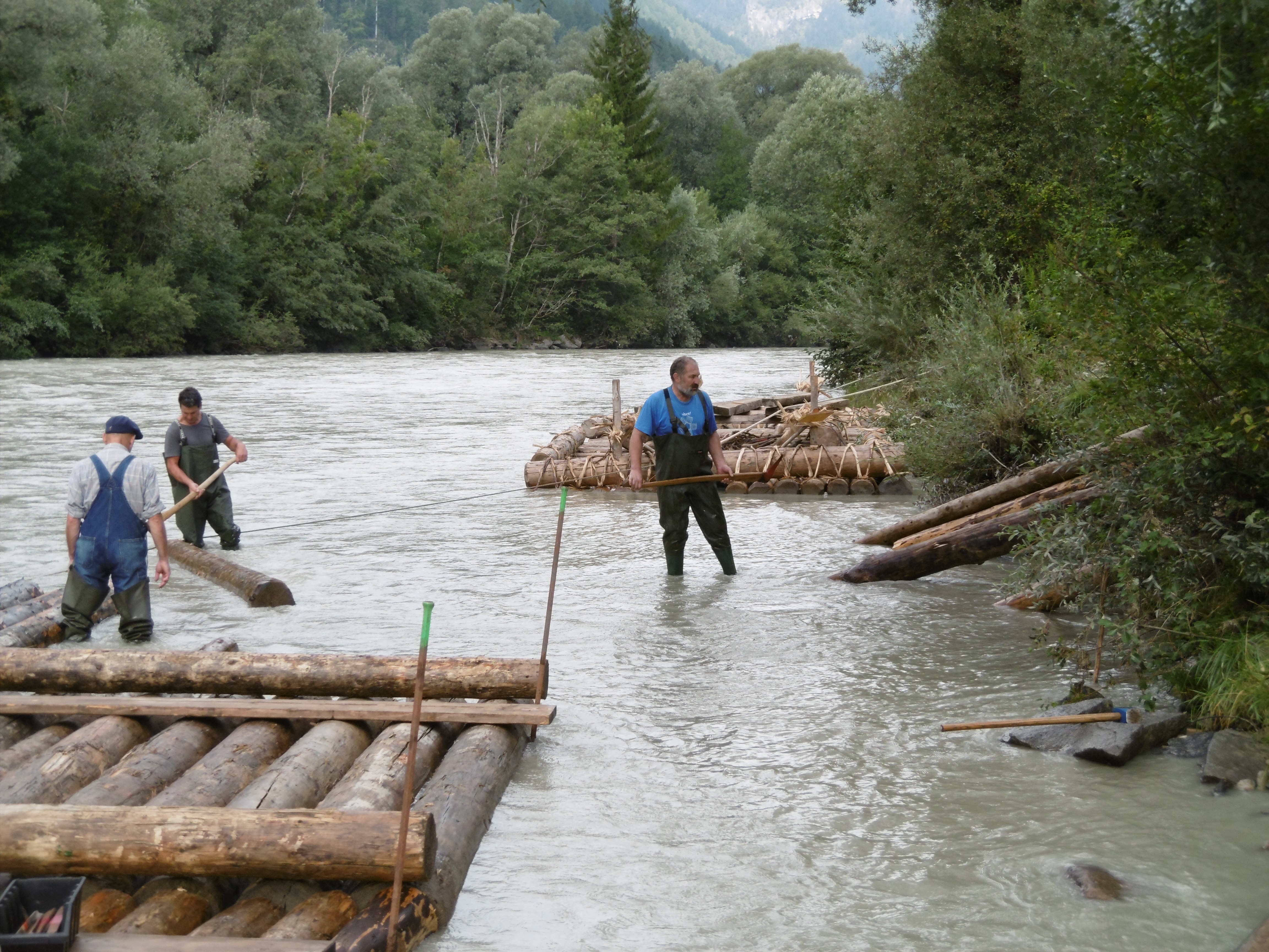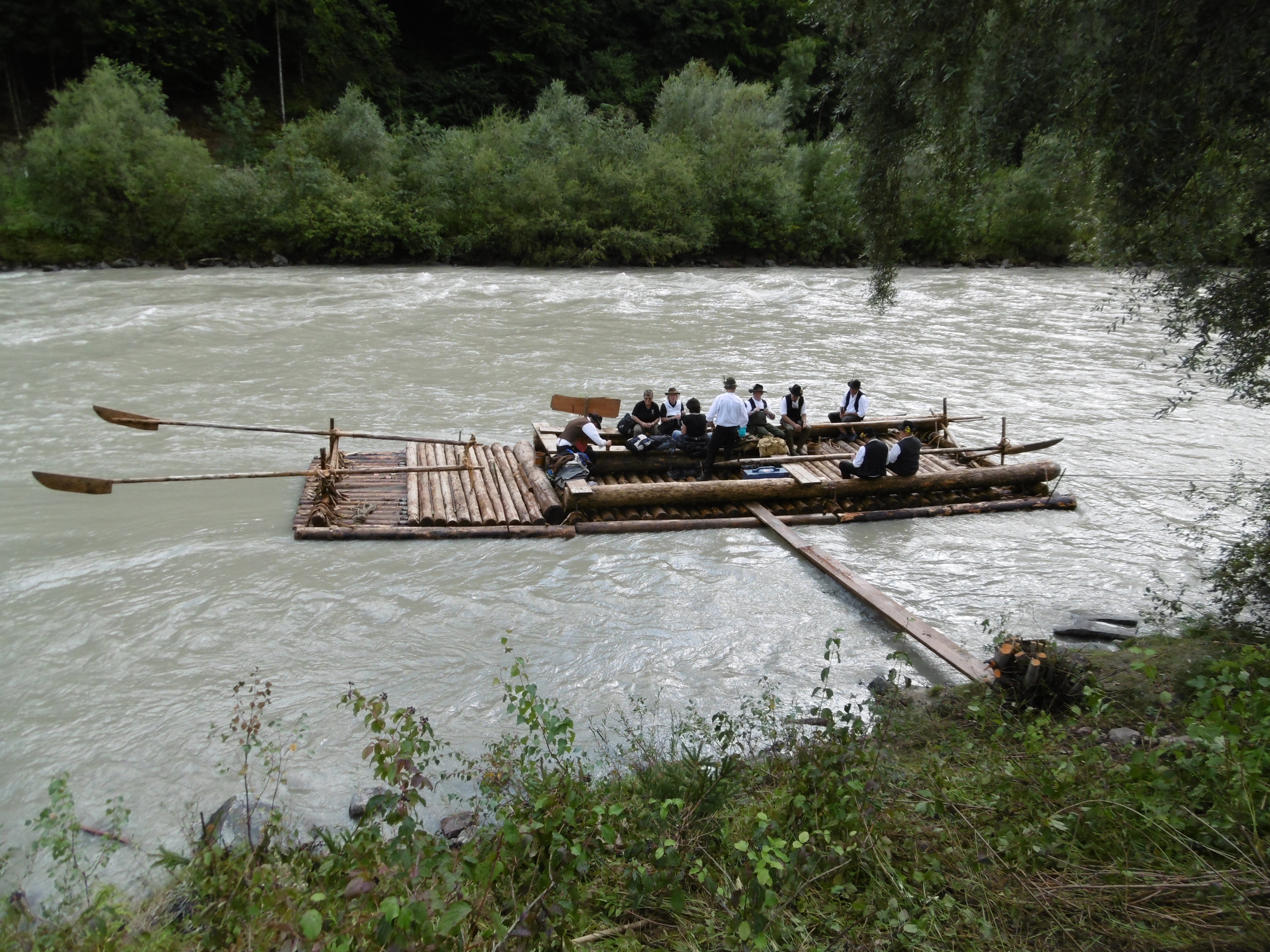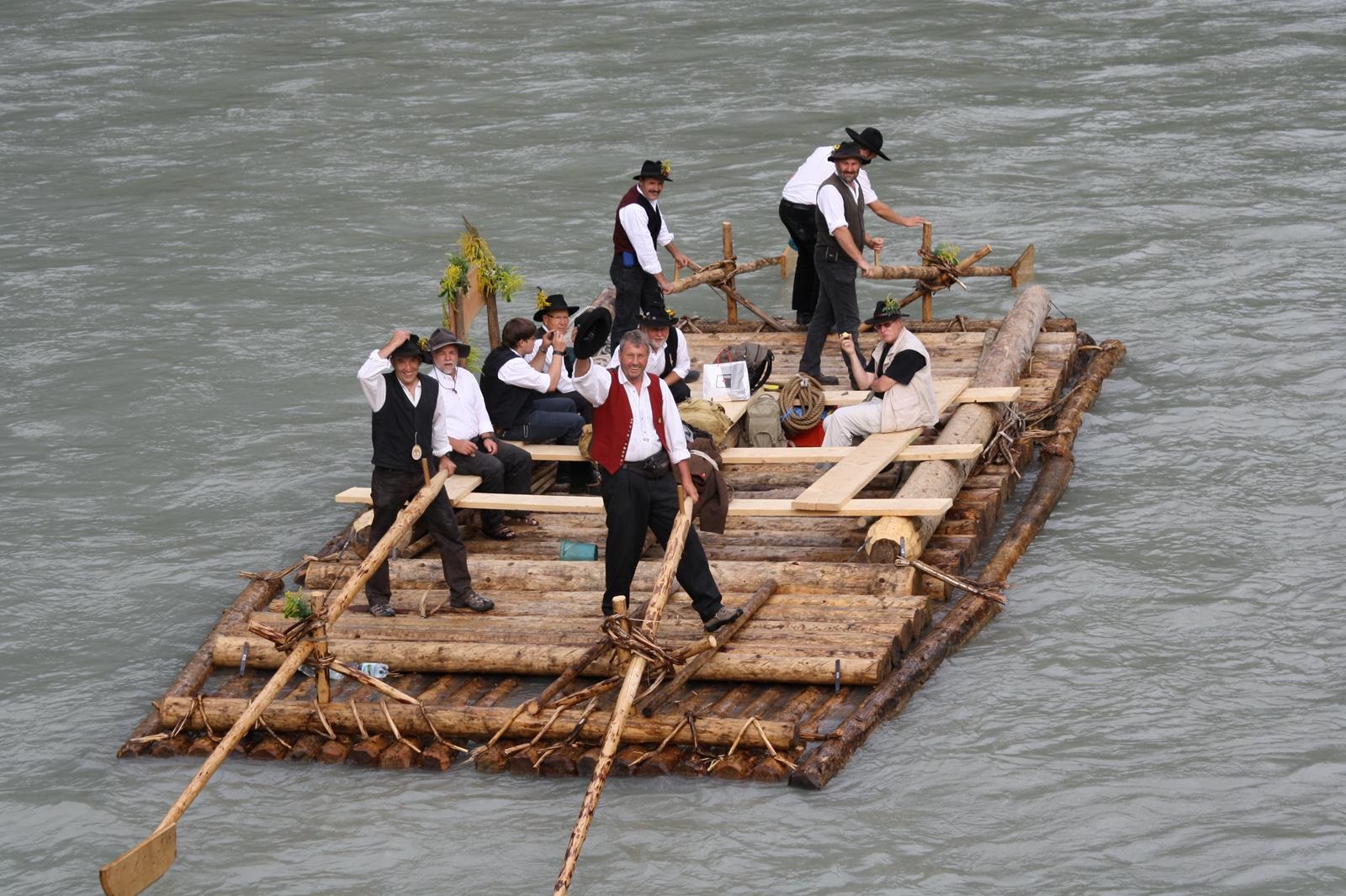 Die Schiltacher bauten zunächst ein Drau Floß mit dem bereitgestellten Holz. Die Floßkonstruktion ist auf den rauen Gebirgsfluss abgestimmt und verfügt jeweils über zwei Ruder zur Steuerung vorn und hinten am Floß.