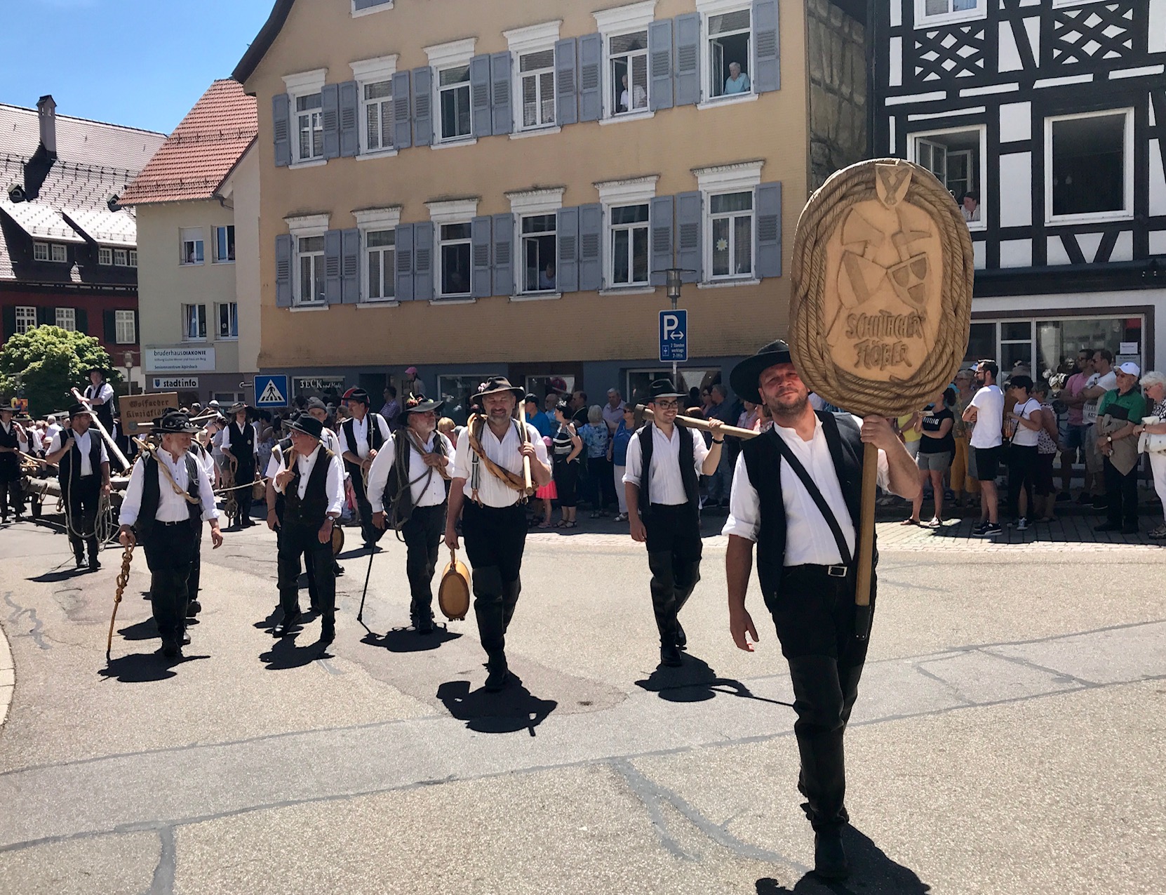 Großen Beifall der Zuschauer erhielten die Schiltacher Flößer, ausgerüstet mit den historischen Werkzeugen und den traditionellen Wieden zum Einbinden der Flöße.