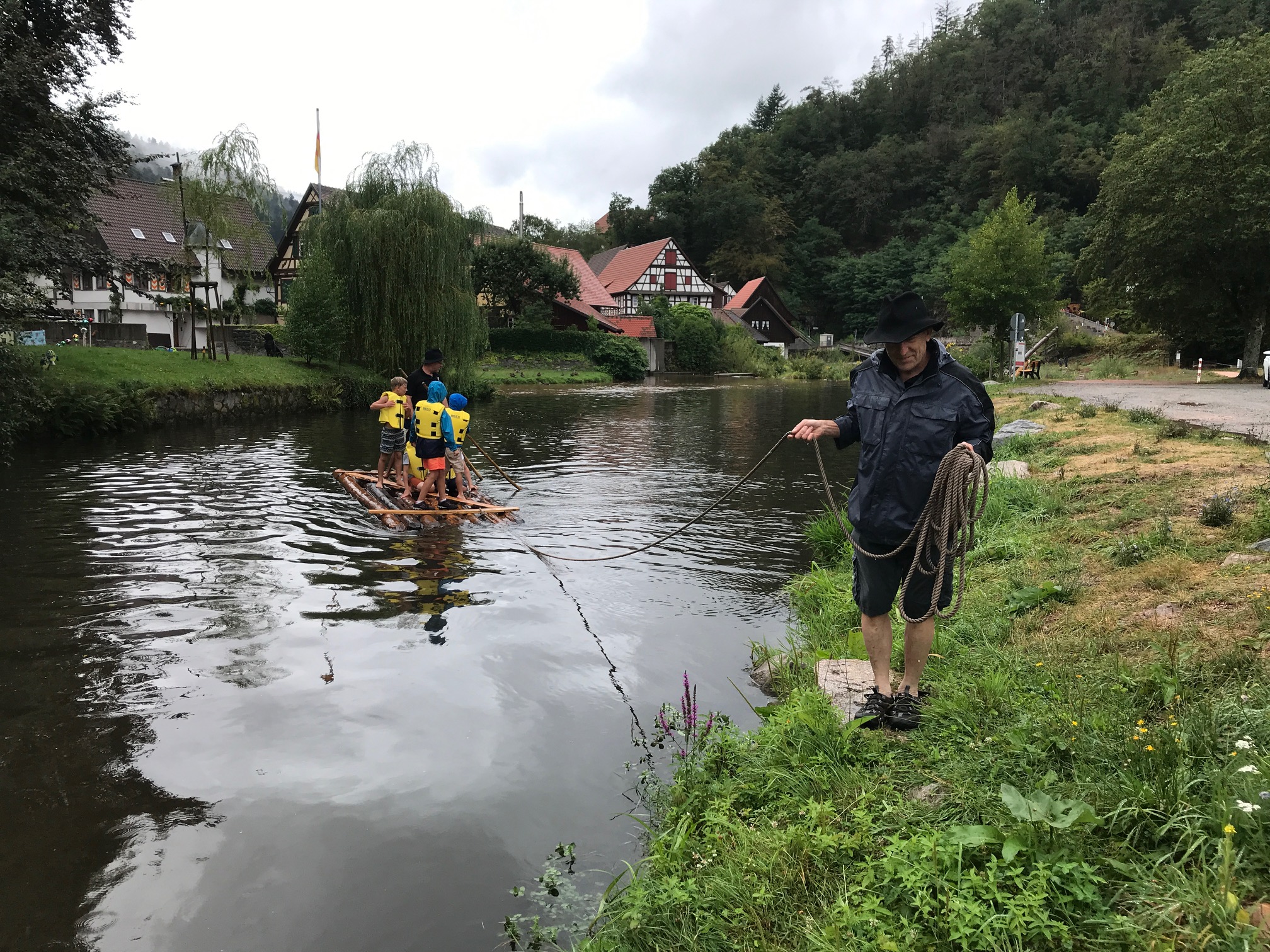 | Das schlechte Wetter hat uns nicht geschreckt: 12 Jungs aus Schiltach waren begeisterte Floßbauer- Haselnuss-Stecken schneiden, ablängen, entrinden und zu einem kleinen Gestör einbinden, die sie dann in der Kinzig zu Wasser bringen konnten. Der Höhepunkt des Kinder-Ferienprogramms war aber dann eine richtige Floßfahrt auf der Kinzig am Hochmuthsteich unter der Aufsicht und Begleitung von erfahrenen Flößern. Mal sehen ob die Begeisterung anhält und aus den Jungs später echte Flößer werden. |