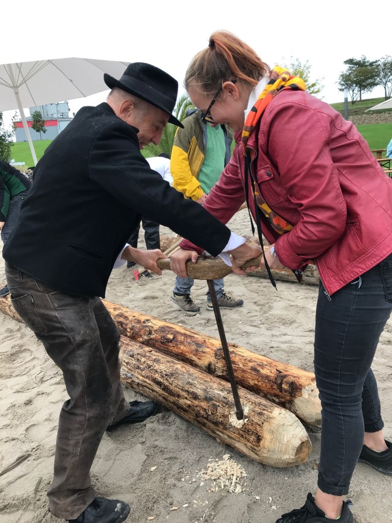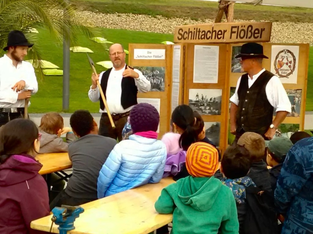 Auch die Kleinen kamen nicht zu kurz. Am alten Floßhafen und auf dem Karlsee im Gelände der Bundesgartenschau, demonstrierten die Flößer bei mehreren Veranstaltungen für Schulkinder und Jugendliche, die Arbeiten der historischen Flößer. Holzstämme wurde gebohrt und „geschnätzt“ und die Handhabung mit Drehhaken und Beil gezeigt. Die Kinder konnten selbst mit Hand anlegen und so ein Gefühl für die schwere und schwierige Arbeit der Flößer entwickeln.