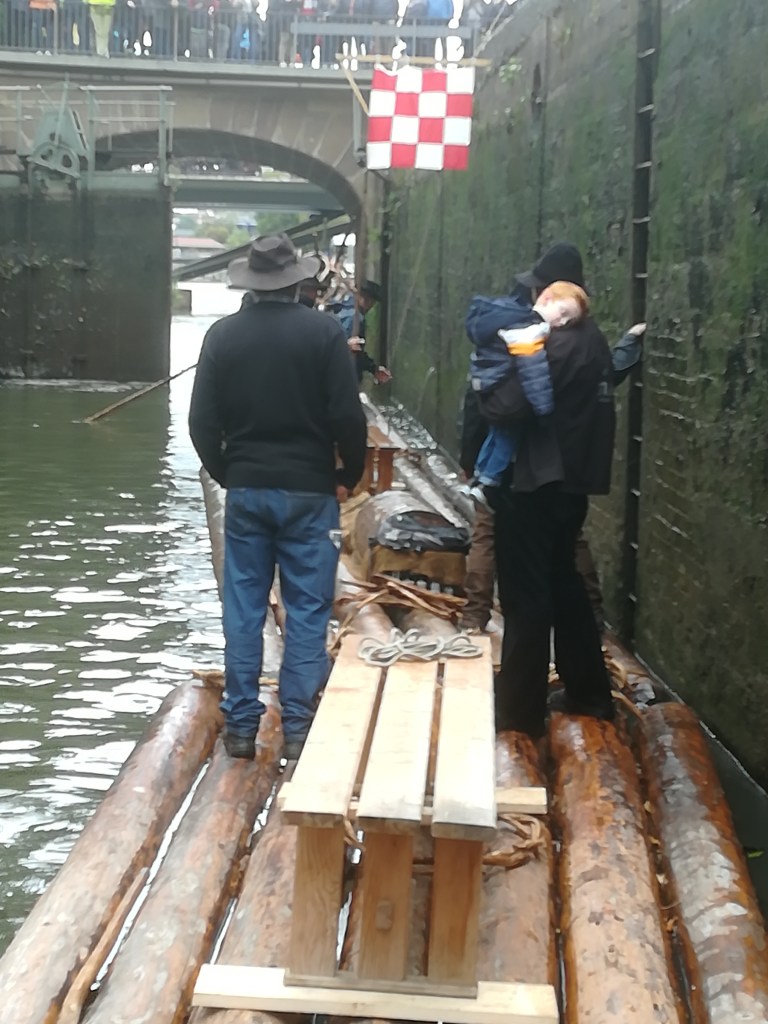 Die Floßfahrt der „Schiltacher Flößer“ mit ihrem langen Gestörfloß durch den Wilhelmskanal in den alten Neckar waren eine Herausforderung für die Flößer, aber auch eine umjubelte Attraktion am Aktionstag. Der Schirmherr, Umweltminister Franz Untersteller, konnte die lautlose und Co2 freie Floßfahrt in vollen Zügen genießen und die Stadt Heilbronn aus einer neuen Perspektive wahrnehmen. Etwas versteckt war auf dem Floß ein kleiner Elektromotor eingebaut, der – Batterie getrieben – das Floß gegen die Strömung schieben konnte. Die gemeinsame Floßfahrt war auch eine gute Gelegenheit mit dem Minister über aktuelle Themen zu sprechen.