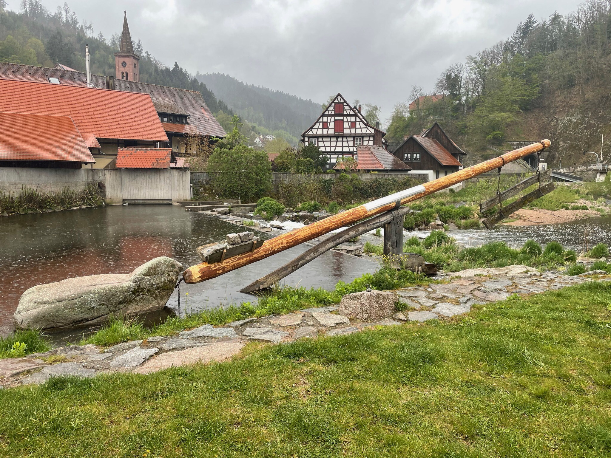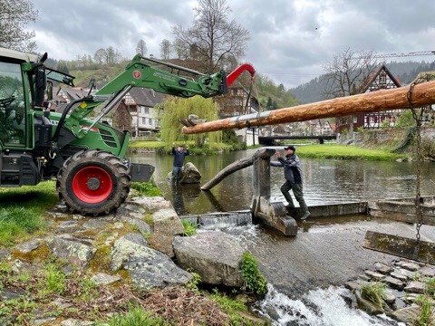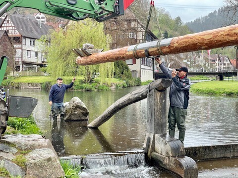 Für die Schiltacher Flößer war ein kurzfristiger Arbeitseinsatz angesagt: im Stadtwald wurde eine stattliche Lärche gefällt und auf die passende Länge von 12,40 m zugerichtet. Einerseits wurde der Steinkasten montiert, der als Gegengewicht zu den schweren Eichenbrettern dient, die mit Ketten am Gamberbaum befestigt sind und das Fahrlocham Wehr verschließen. Die vorhandene Dreheinrichtung konnte wieder verwendet werden, musste aber auf die neue Dimension angepasst werden.