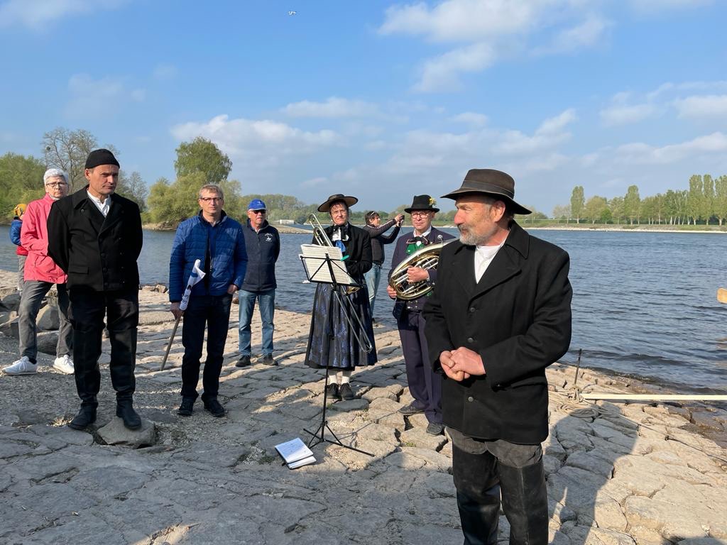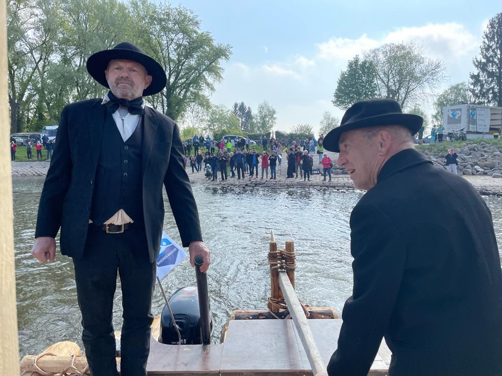 Großer Bahnhof bei der Abfahrt in Steinmauern. Bürgermeister Wolfert spricht Grußworte,Floßmeister Kipp erläutert die Beweggründe für die RheinFloßfahrt. Auch der Chef der Deutschen Flößervereinigung Martín Spreng lobt unser Projekt: ihr haltet die Flößertradition aufrecht und seid eine Empfehlung für die UNESCO Kommission zur Aufnahme der Flößerei als immaterielles Kulturgut.