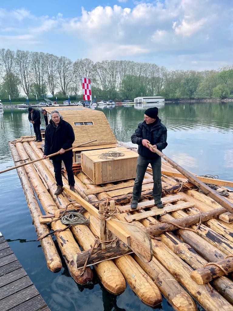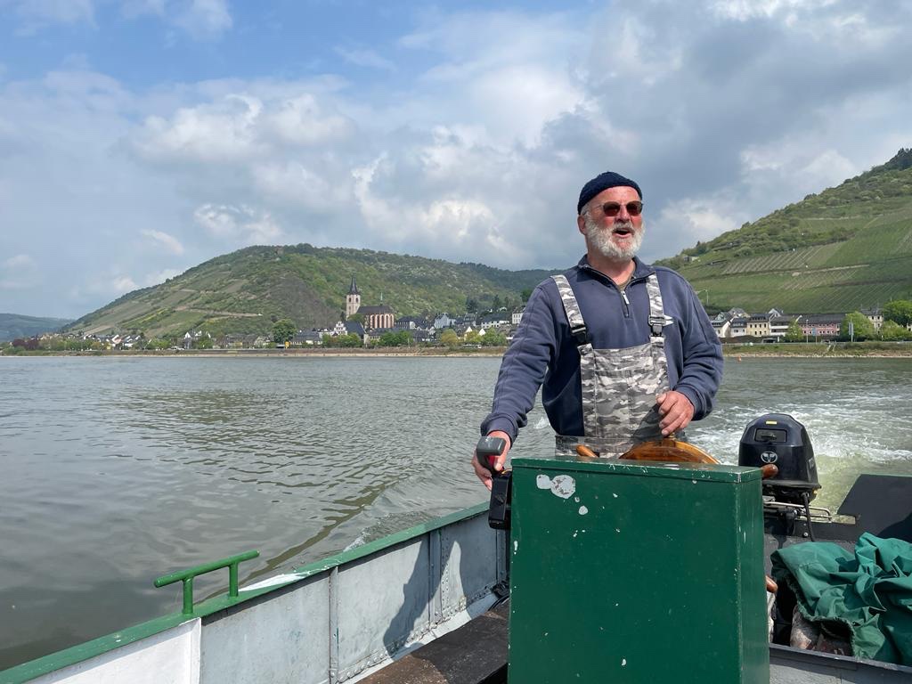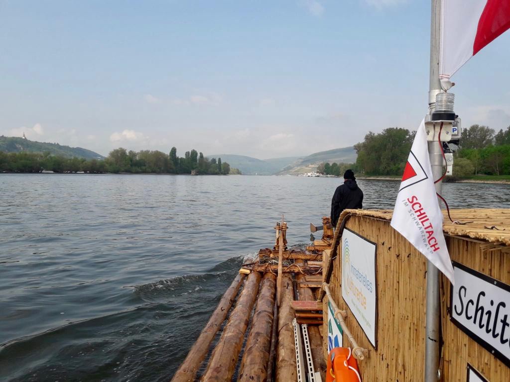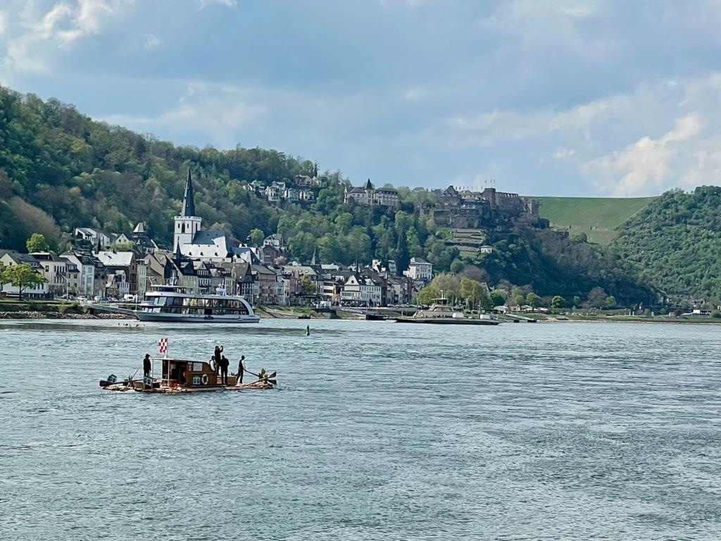 Beim Start im Hafen von Schierstein gießt es in Strömen – offenbar hat der Himmel beschlossen, dass das Floß einmal gewaschen werden muss. Auf dieser Fahrt durchs Gebirge ist höchste Aufmerksamkeit gefordert. Am Binger Loch verengt sich der Rhein, gleichzeitig steigt die Strömungsgeschwindigkeit: wir gleiten mit 14 Km/h vorbei an Weinbergen, Villen und alten Burgen.