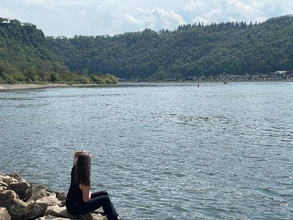 Unsere Heide kämmt ihr Haar am Loreley Felsen, kann aber die Flößer nicht bezaubern. Wir gleiten sicher weiter vorbei an Frachtschiffen und Ausflugsbooten bei St. Goar. Plötzlich kommt ein Gewitter auf, mit Hagel und Blitzschlag. Nochmals frisch geduscht legen wir in Kamp Bornhofen an.