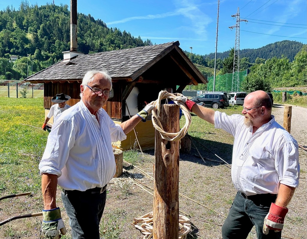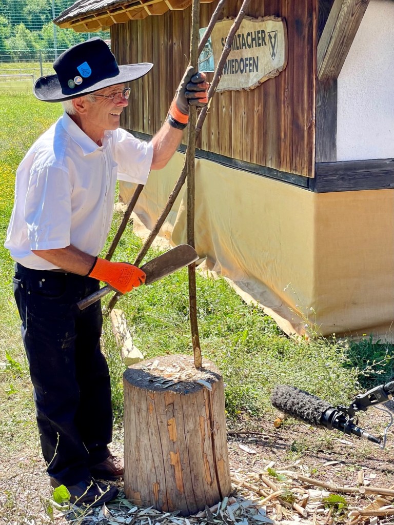 Für den zweiten Drehtag wurde der Wiedofen angeheizt und mehrere Bündel von Haselnuss Stecken im Ofen gebäht und danach zu Wieden gedreht.