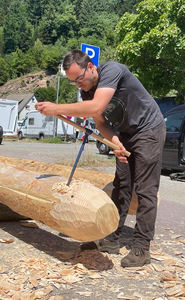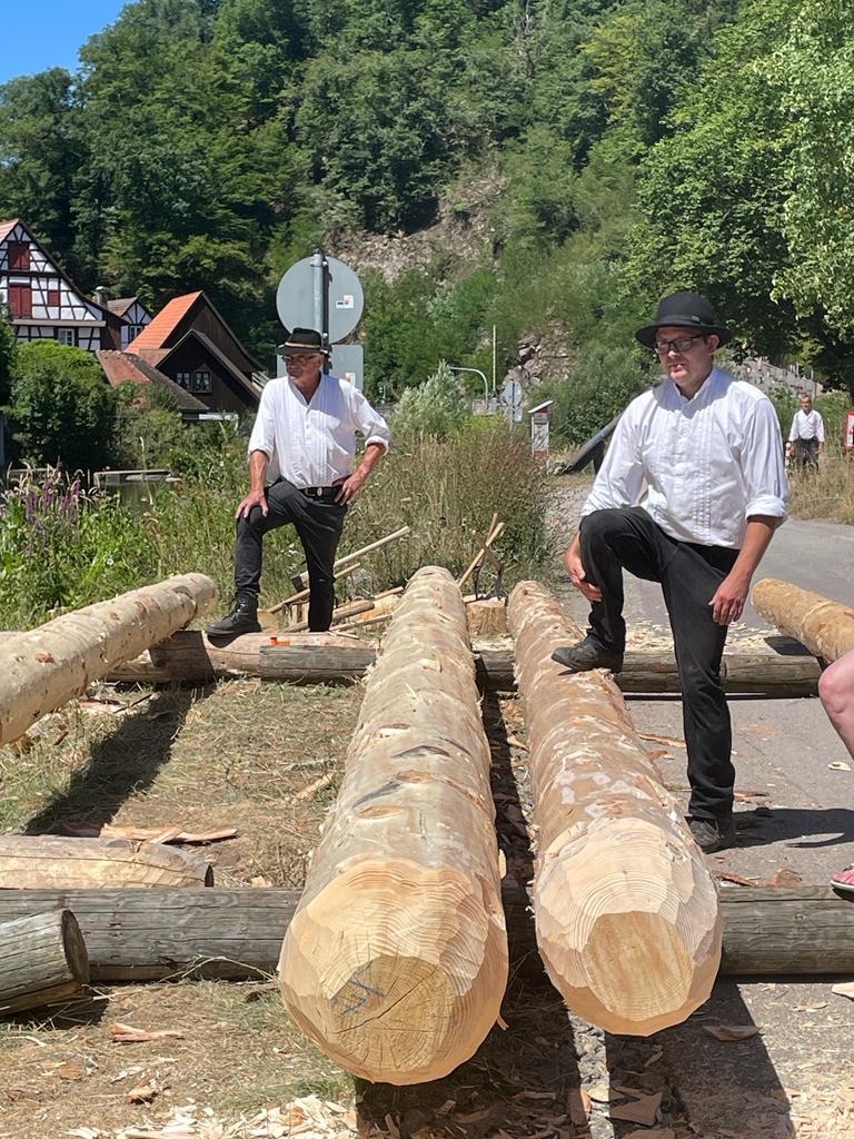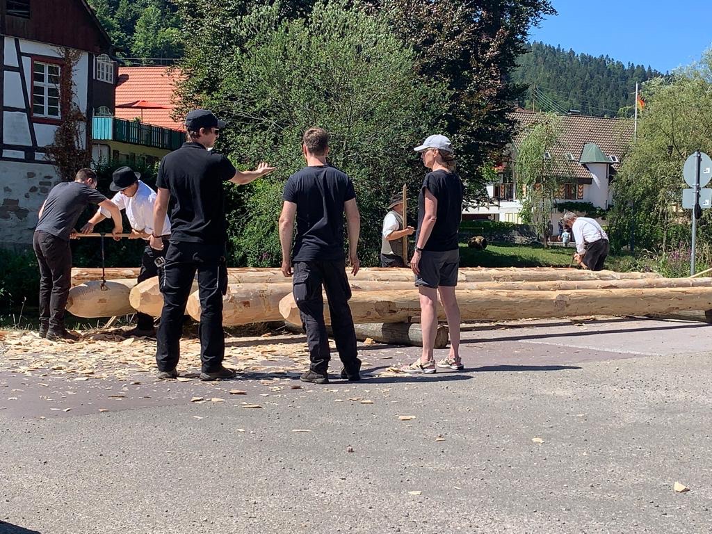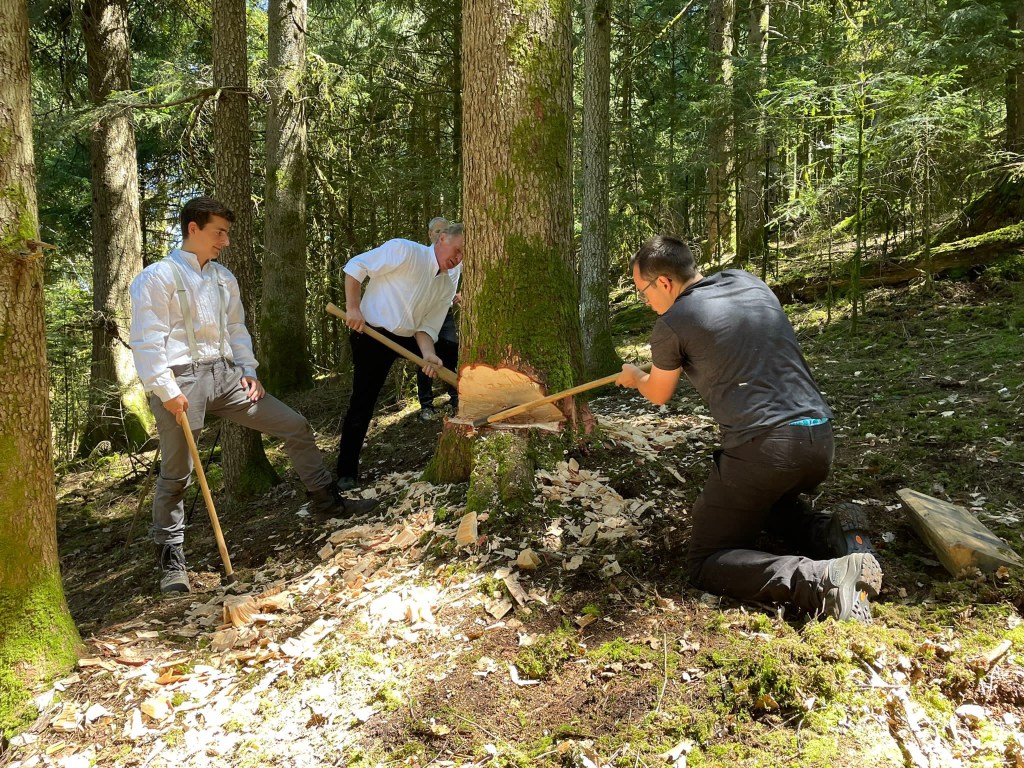 Am ersten Tag wurde eine mächtige Tanne im Schiltacher Stadtwald mit der Axt gefällt, danach entastet und entrindet.