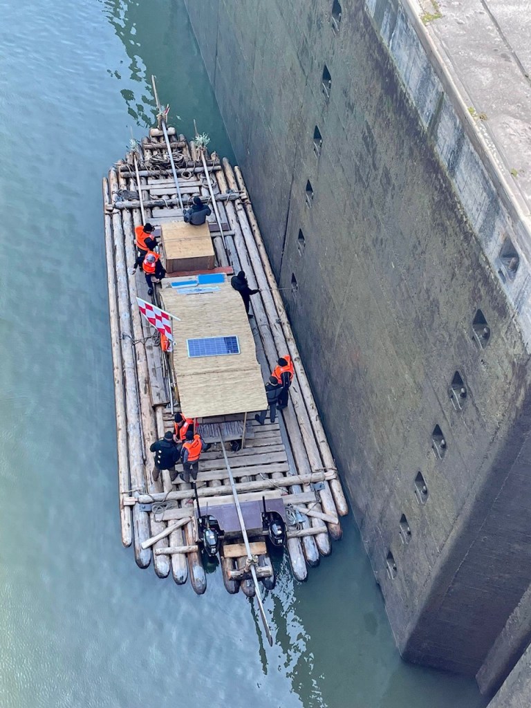 Hartmut fotografiert das Floß von oben, im Vergleich zu den Schubschiffen sind wir verschwindend klein.