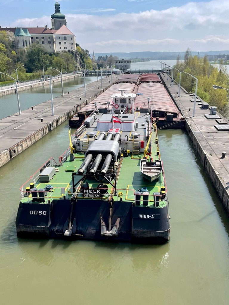 Schloss und Hafen Grein grüßen auf der linken Seite. Bisher war die Donau friedlich, doch jetzt kommt Wind auf und schickt uns hohe Wellen. Wir kämpfen uns vorwärts durch die Wogen und erreichen die Schleuse Persenbeug. Ein großer Schubverband bekommt Vorfahrt. Er beansprucht die ganze Schleuse – wir müssen warten.