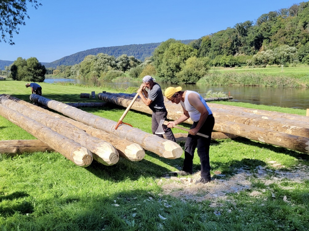 Die Stämme wurden am Ufer zugerichtet und einzeln in die Weser gerollt, um das Floß dann im Wasser zusammen zu bauen. Bei den hochsommerlichen Temperaturen war das Ganze eine schweißtreibende Arbeit. Wie im Schwarzwald üblich, wurden alle Stämme an den Enden „geschnätzt“. Dabei konnte der Schiltacher Flößerobmann, Hartmut Brückner, einmal mehr sein vielseitiges Können mit dem Beildemonstrieren.