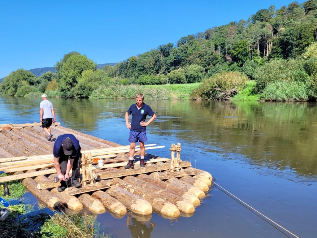 Ein ganzer Satz scharfer Beile, Floßhaken, Seile und frisch gewässerter Wieden waren im Gepäck. Die dortige Flößervereinigung, mit ihrem Vorsitzenden Eckhard Meyer, hatte sie eingeladen ein Floß, mit Holz aus dem Reinhardswald im Wesertal, nach KinzigtälerVorbild zu bauen.