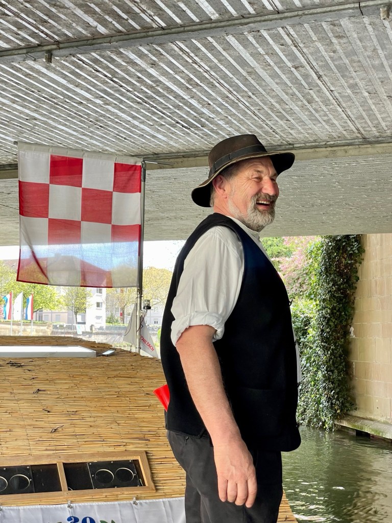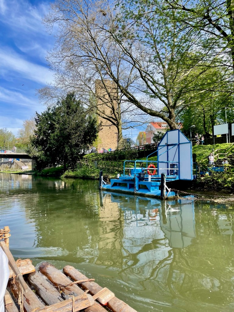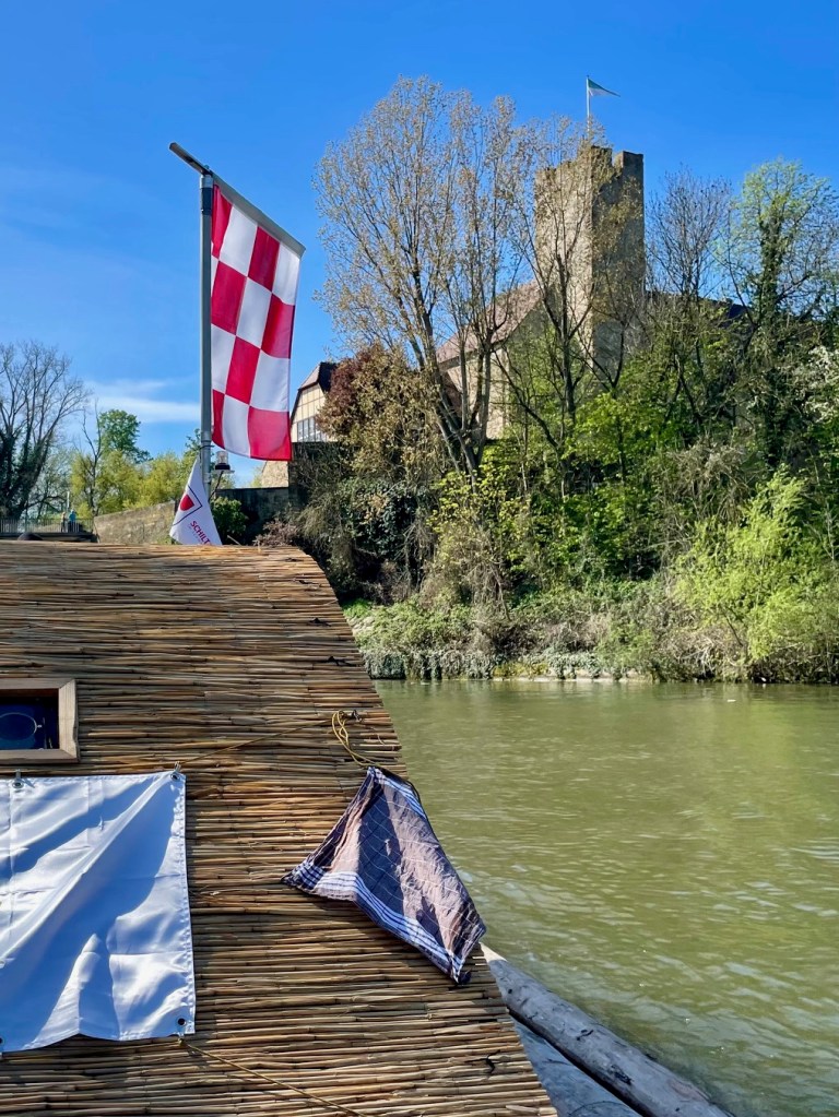 Kurz vor Heilbronn biegen wir in den alten Neckar ein und fahren am Götzenturm vorbei. Dann wird es eng, die Durchfahrtshöhe der Hafenweiler Brücke ist gerade mal 3,20 m. Unsere Fahne hat 3,10 m wir passen also gerade noch durch.
