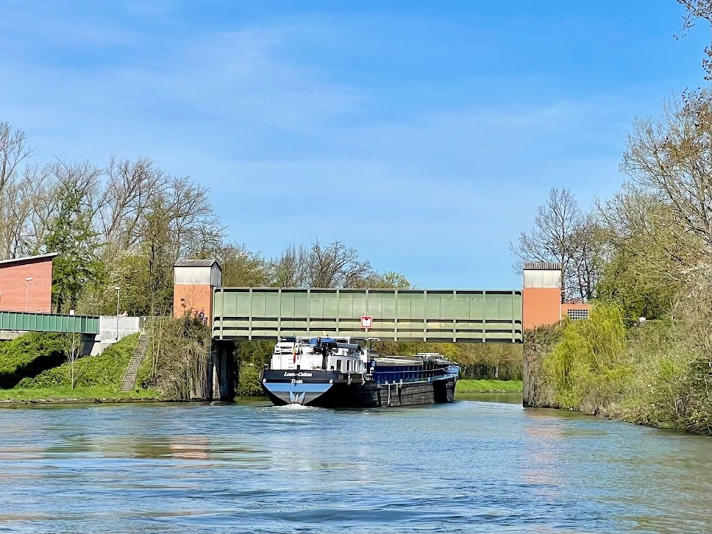 Nach der Schleuse zweigt ein Neckar Kanal ab. Ein großes Boot überholt uns. Seine Aufbauten passen gerade noch unter der Brücke durch.