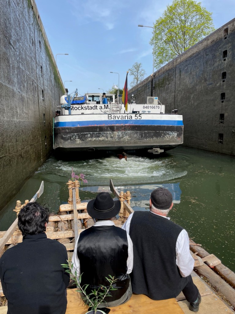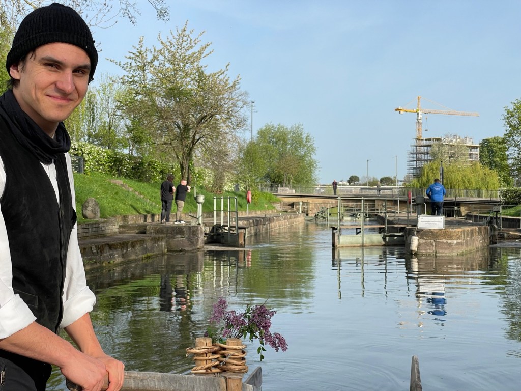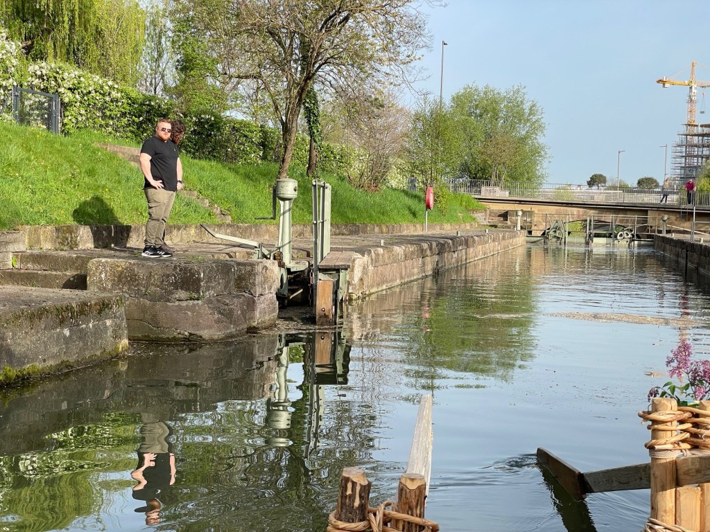 Abfahrt aus Heilbronn auf dem König Wilhelm Kanal. Unsere Freunde vom WMBC öffnen die Schleusentore mit Muskelkraft und Jungflößer Aron steuert sicher durch die Schleuse.