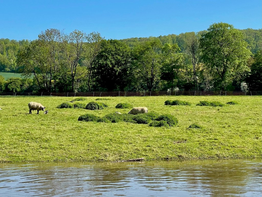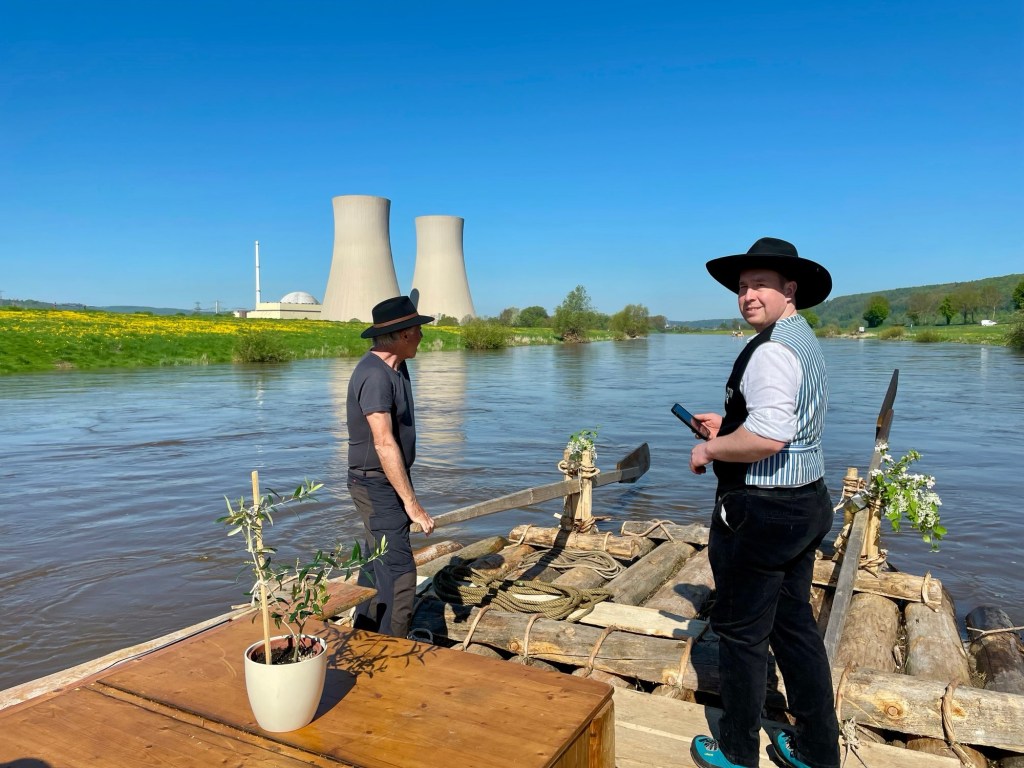 Schon bald haben wir das AKW von Grohnde hinter uns. Auf den fetten Wiesen grasen die Schafe und lassen sich von unserem Floß nicht stören.