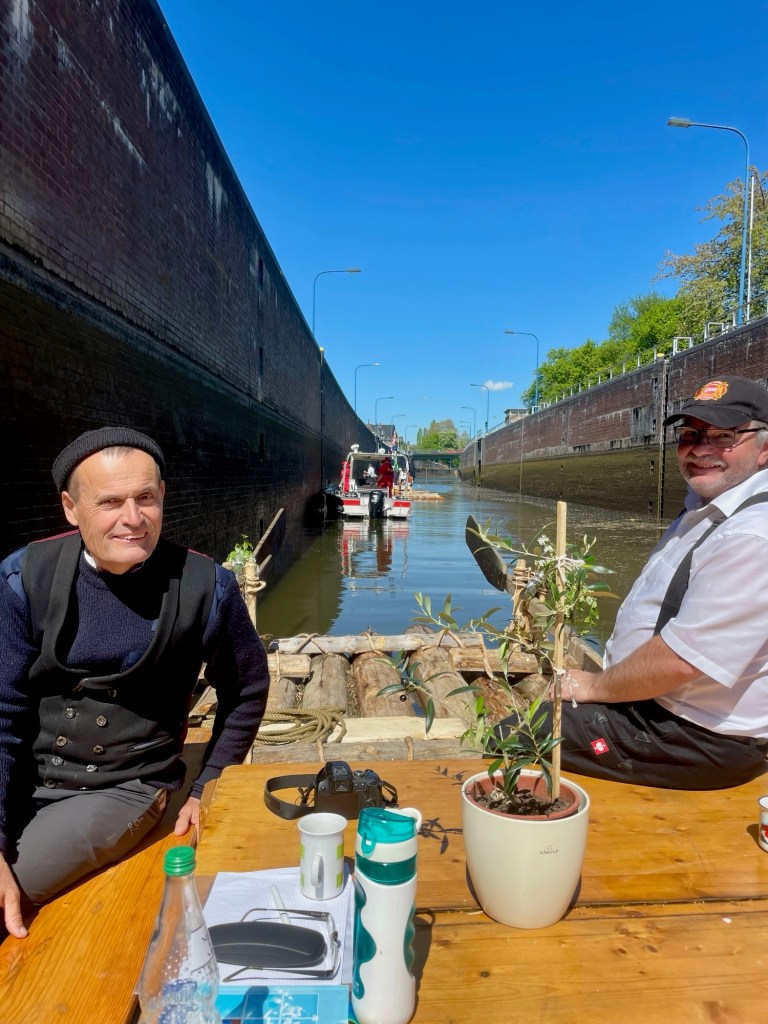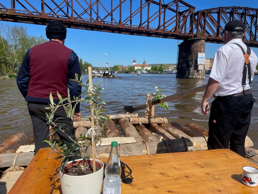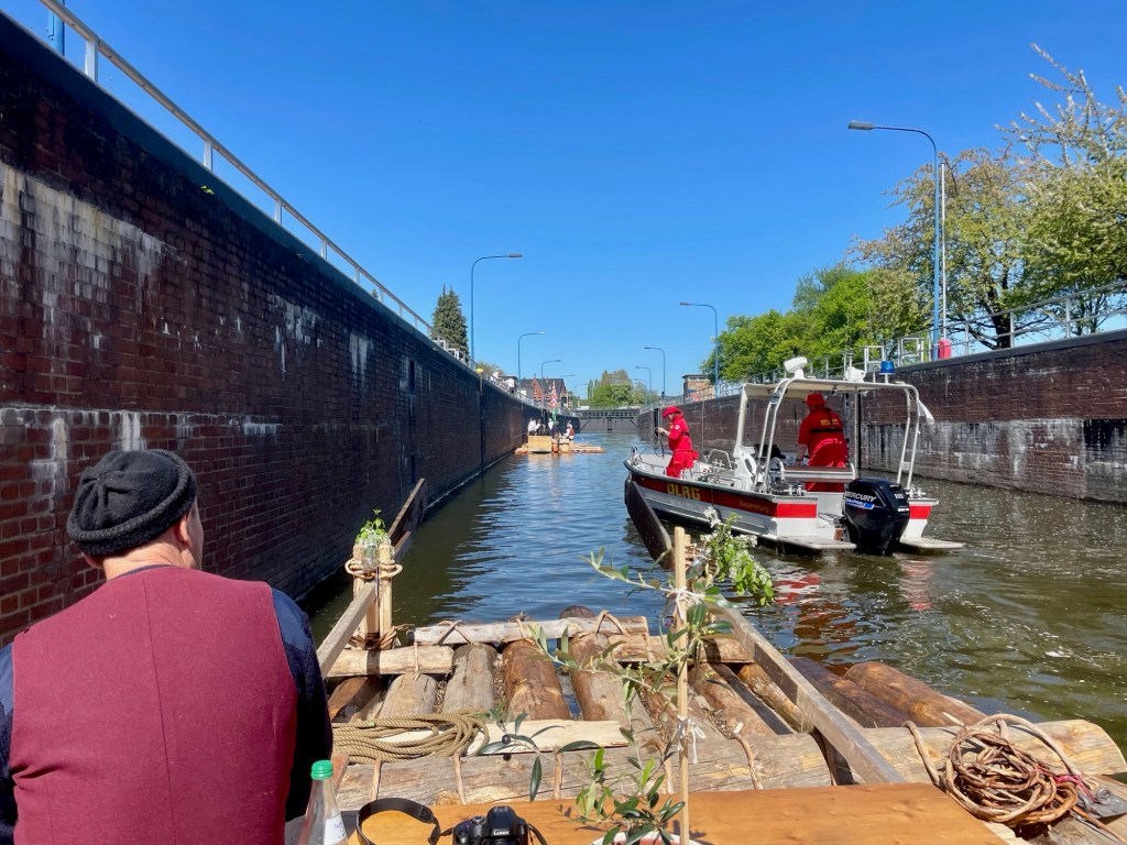 Der Wasserpegel der Weser ist in der Nacht deutlich angestiegen, aber unsere Festmacher und Seile haben gehalten. Der hohe Wasserstand ist von Vorteil: Jetzt können wir auf der Welle fahren und brauchen keinen Motor.