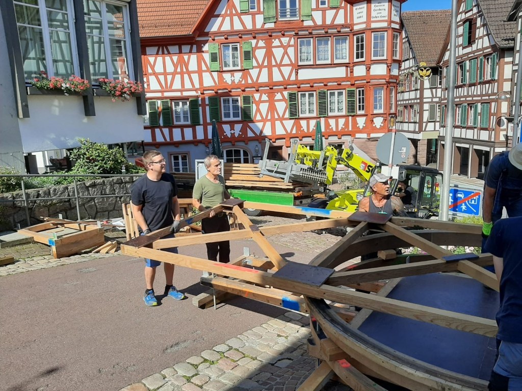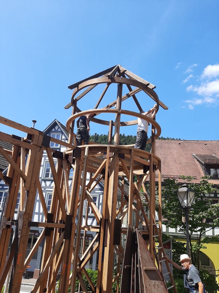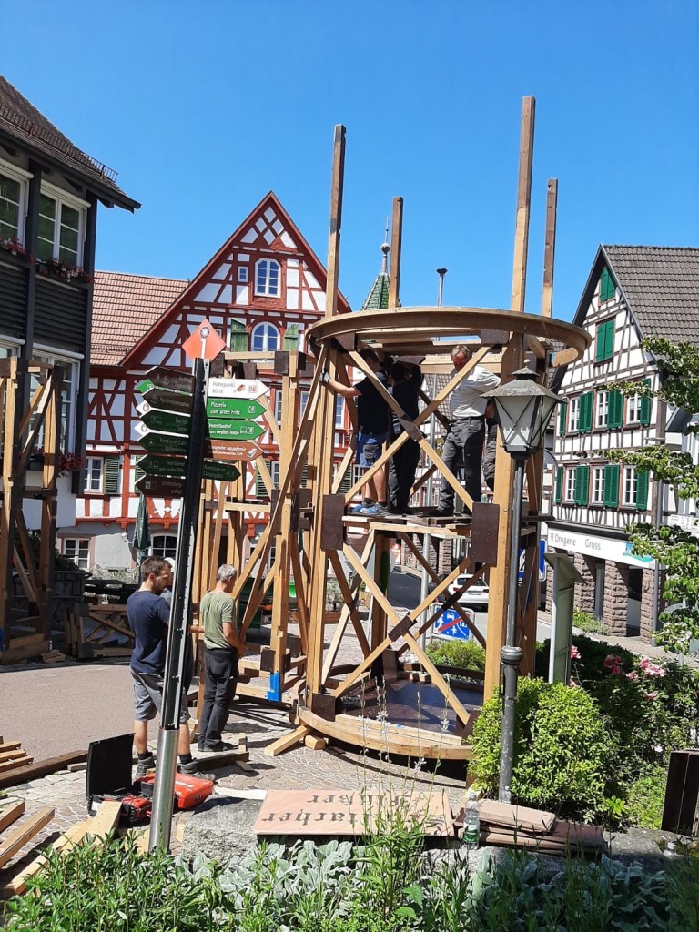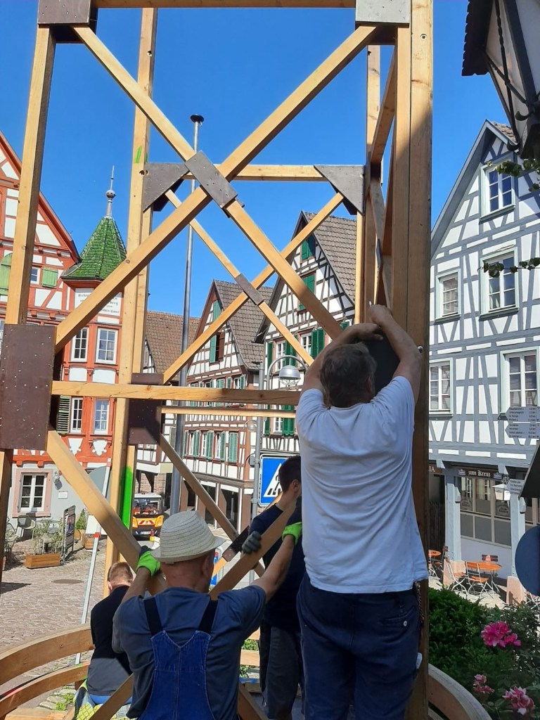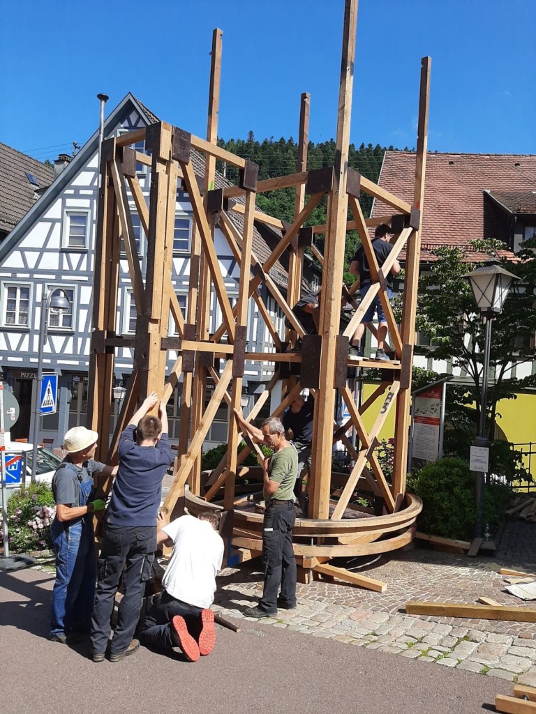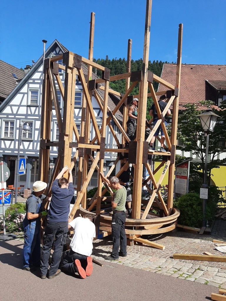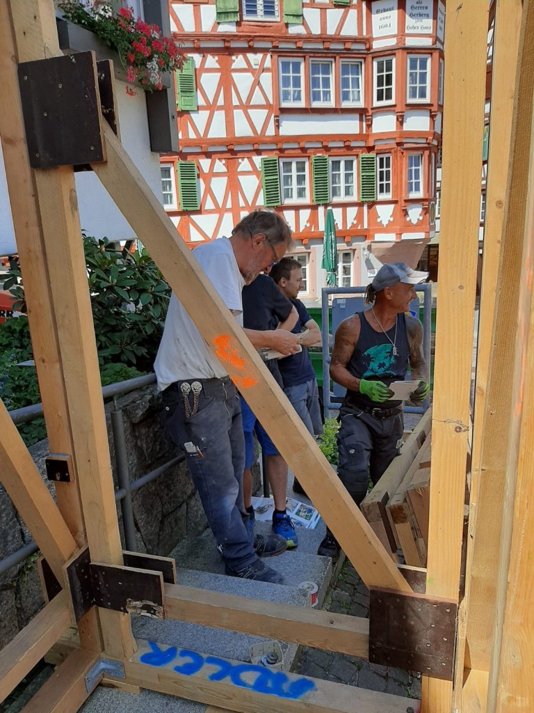 Die Schiltacher Flößer unter Obmann Hartmut Brückner freuen sich sehr, dass sie mit dem Aufbau des Stadttores sowie den in den letzten Tagen montierten Fächerbäumen und dem neuen Schaufloß einen Beitrag zum 750-jährigen Stadtjubiläum leisten konnten.