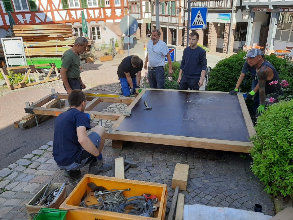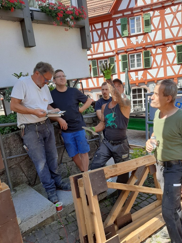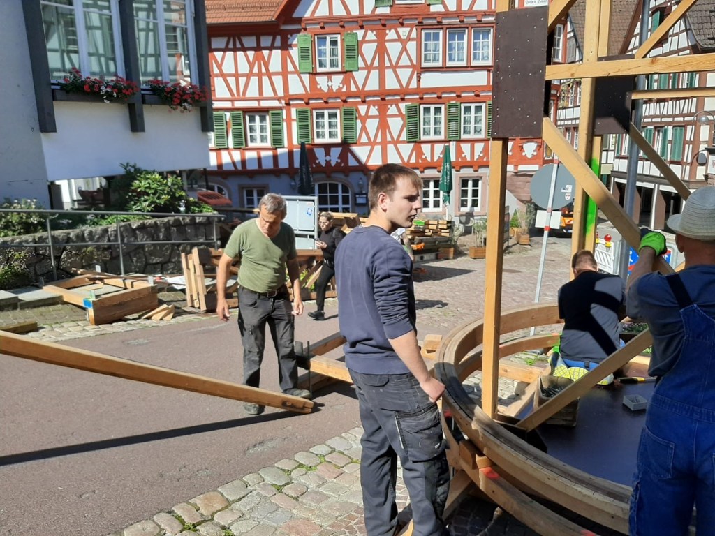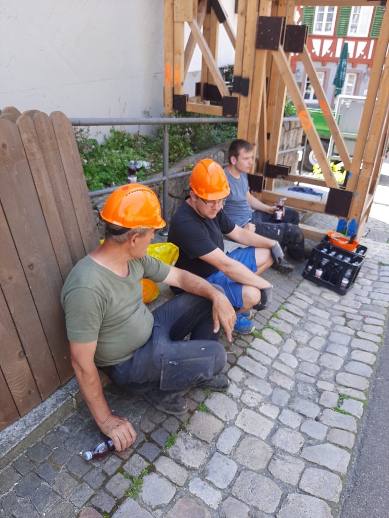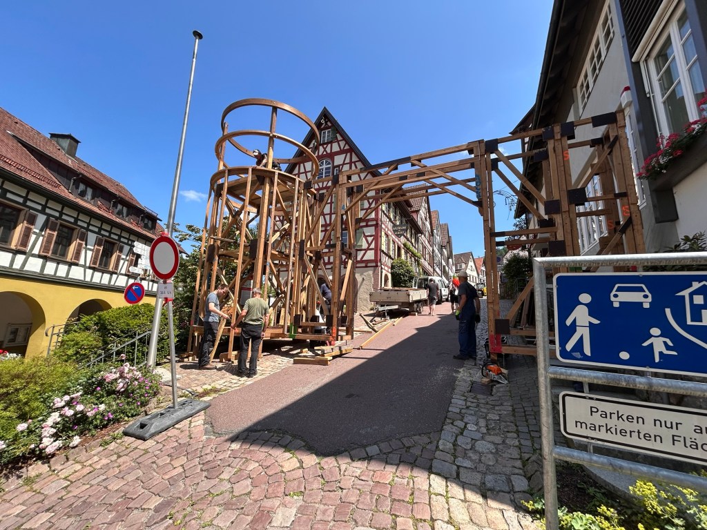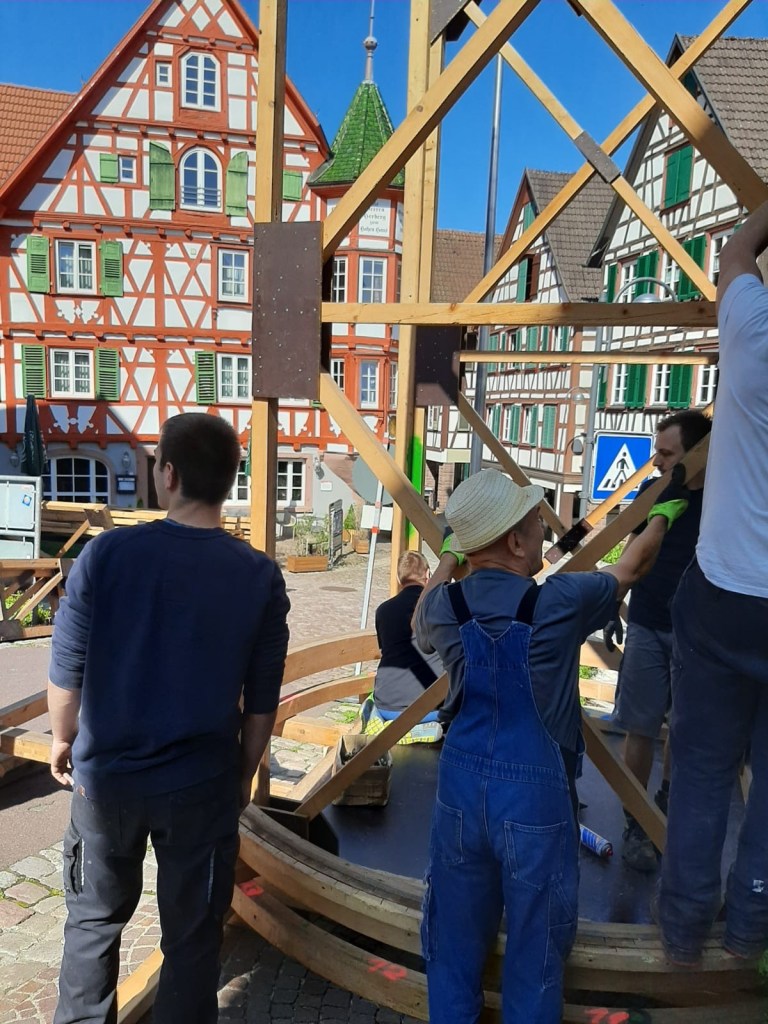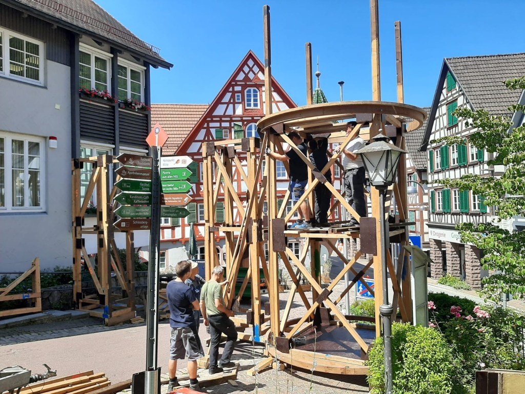 Die Schiltacher Flößer unter Obmann Hartmut Brückner freuen sich sehr, dass sie mit dem Aufbau des Stadttores sowie den in den letzten Tagen montierten Fächerbäumen und dem neuen Schaufloß einen Beitrag zum 750-jährigen Stadtjubiläum leisten konnten.