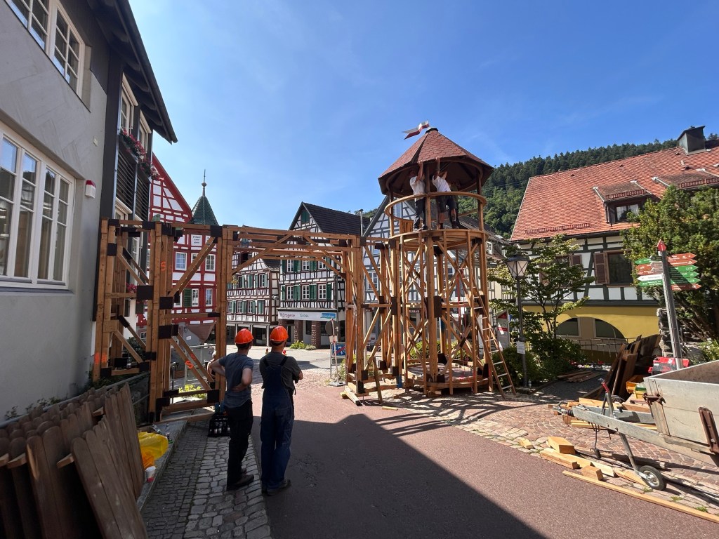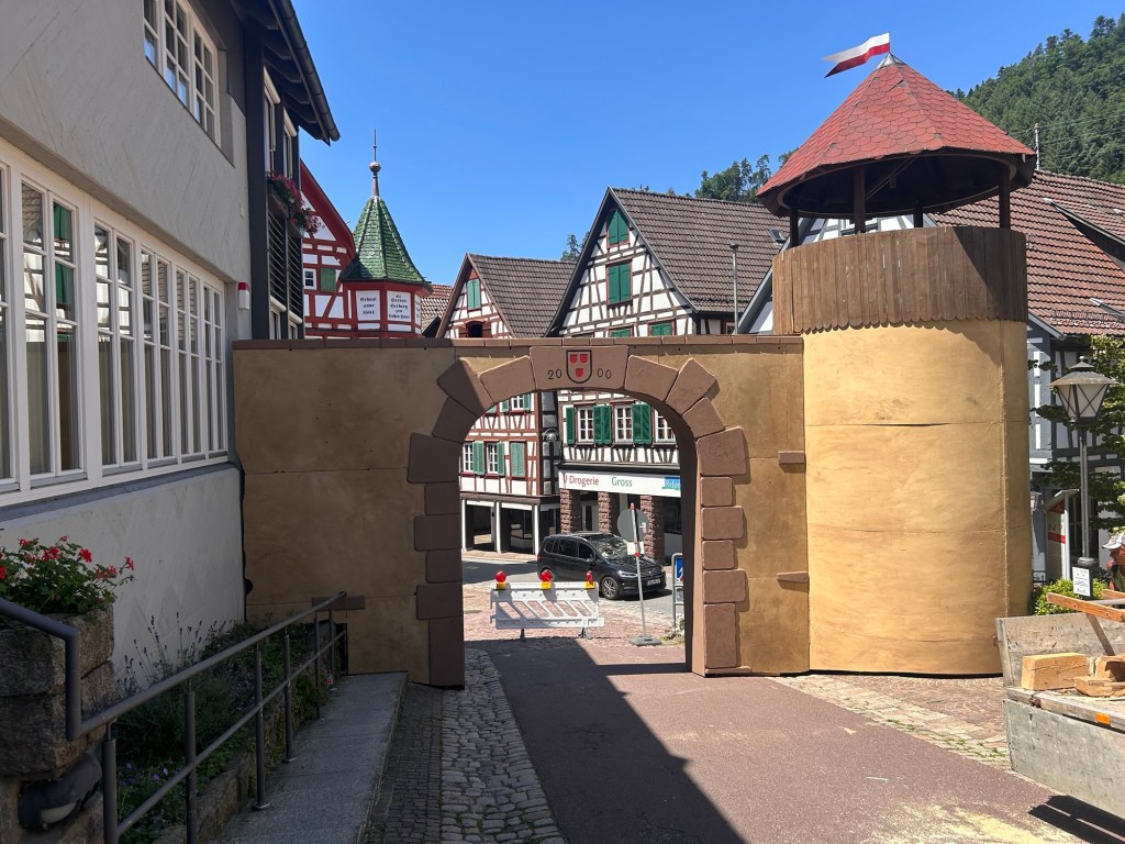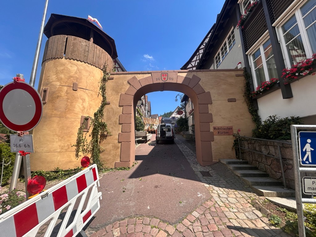 Pünktlich zum 10. Stadtfest der Stadt Schiltach haben die Flößer gemeinsam mit der Firma BTS unter Leitung von Charly Fehrenbacher am 17. und 18. Juni 2025 das Stadttor auf Höhe der Sparkasse aufgebaut. Dies war bereits der fünfte Aufbau dieser Art, nach den Jahren 2000, 2005, 2010 und 2015.