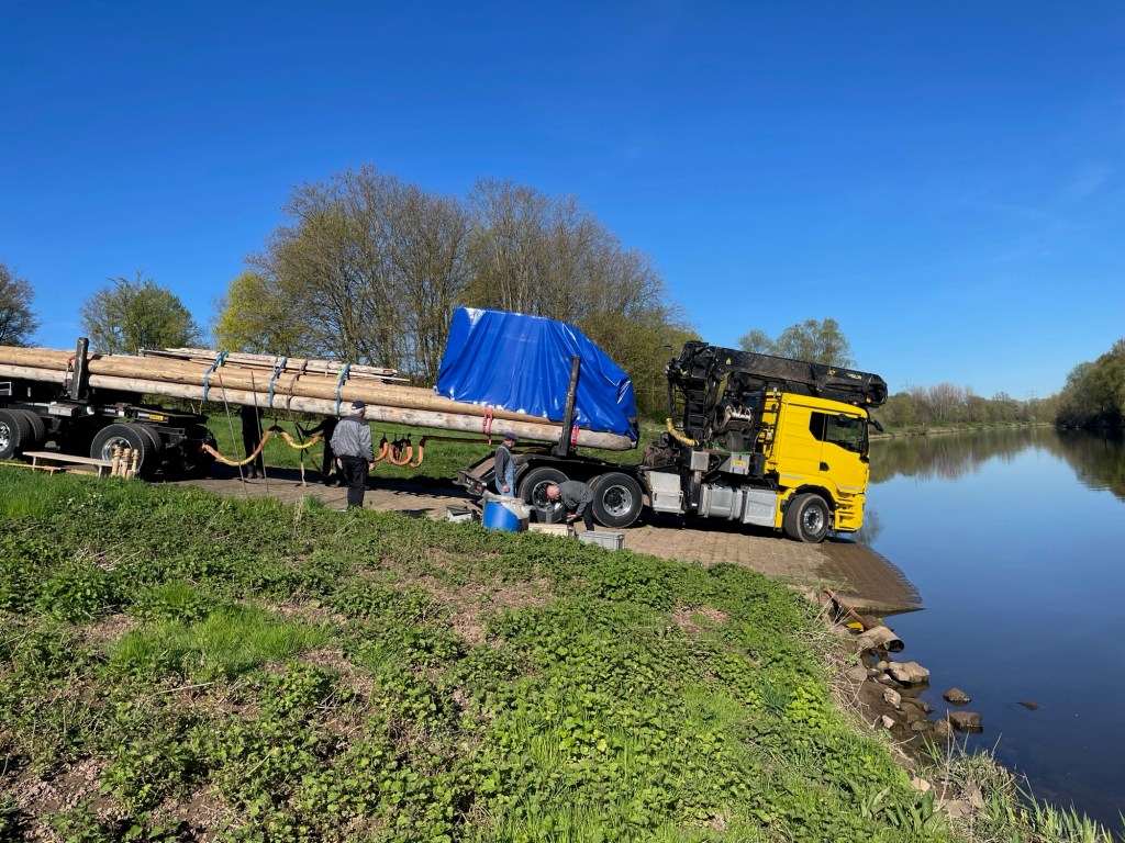 Ein Langholzwagen der Firma Künstle mit den Stämmen und der Hütte ist schon unterwegs zum Startplatz an der Saar bei Beckingen.