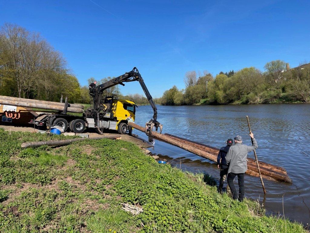 Mit dem Kran wird das Holz entladen und in der Saar zum Floß eingebunden.