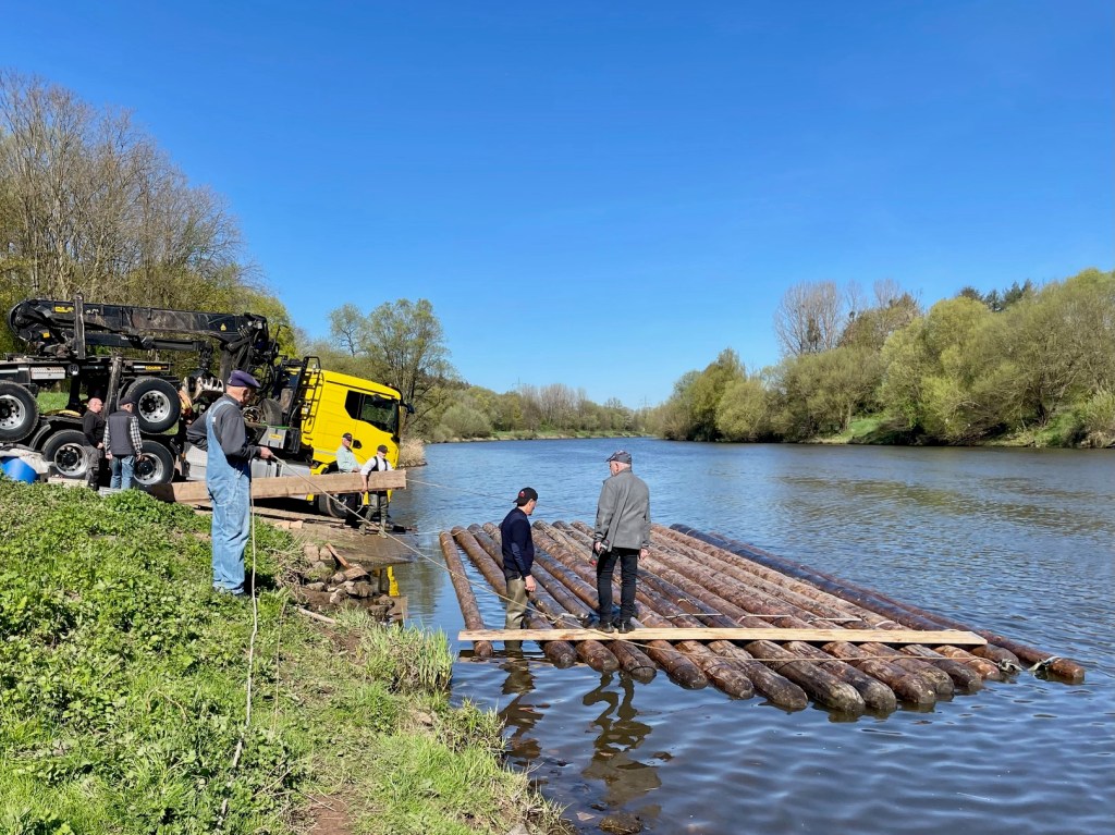 Mitarbeiter des WSA setzen im Fluß eine grüne Boje zur Sicherheit für das Floß und Information für vorbeifahrende Schiffe.