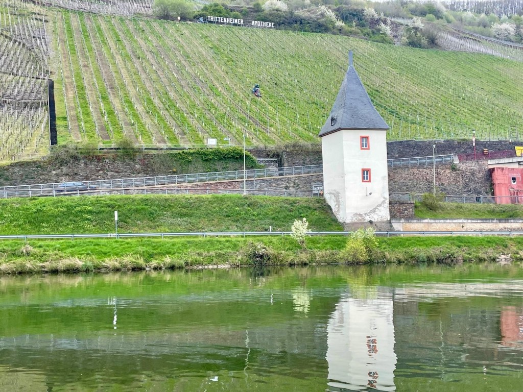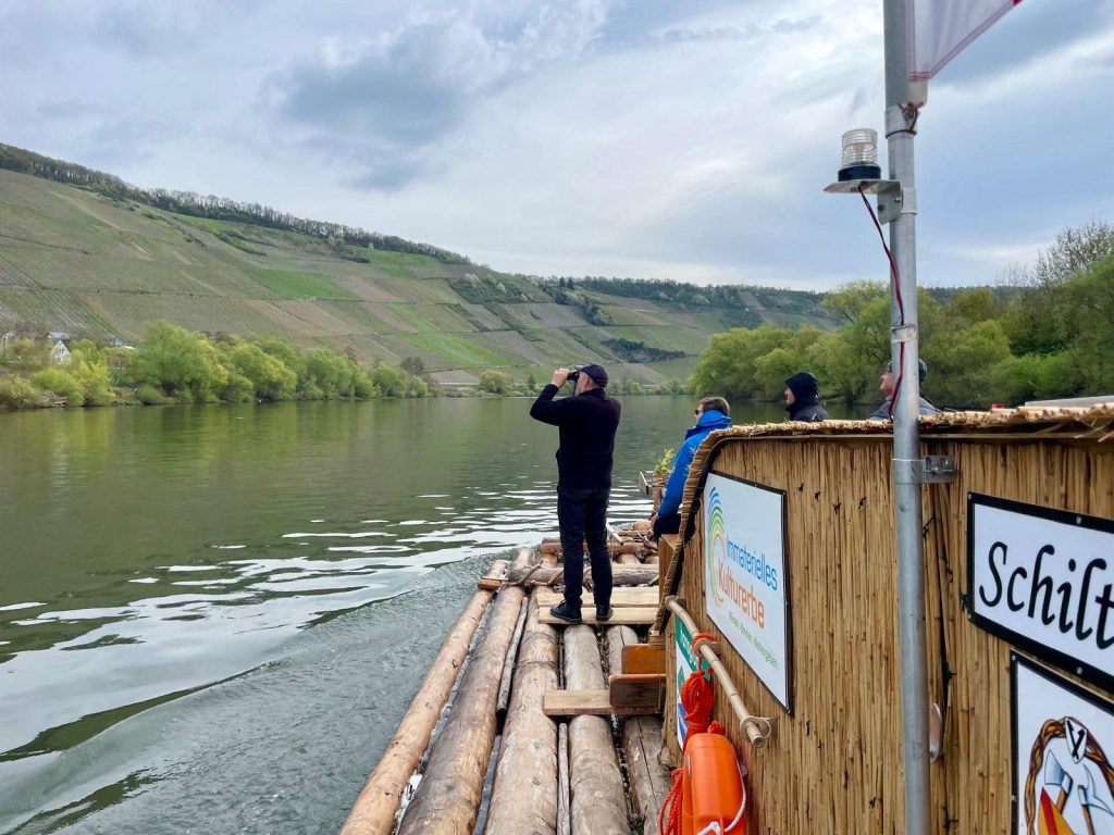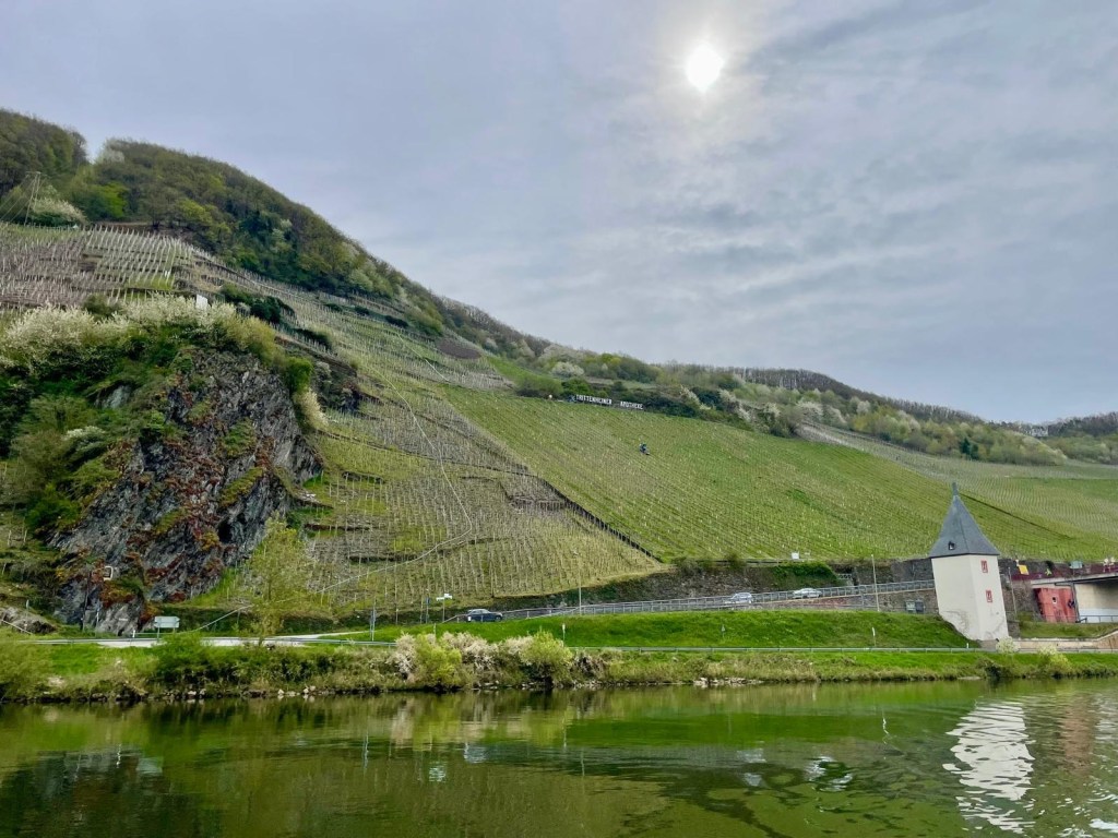 Die Mosel windet sich durch die Landschaft, links und rechts teilweise steile Rebhänge mit berühmten Weinlagen.